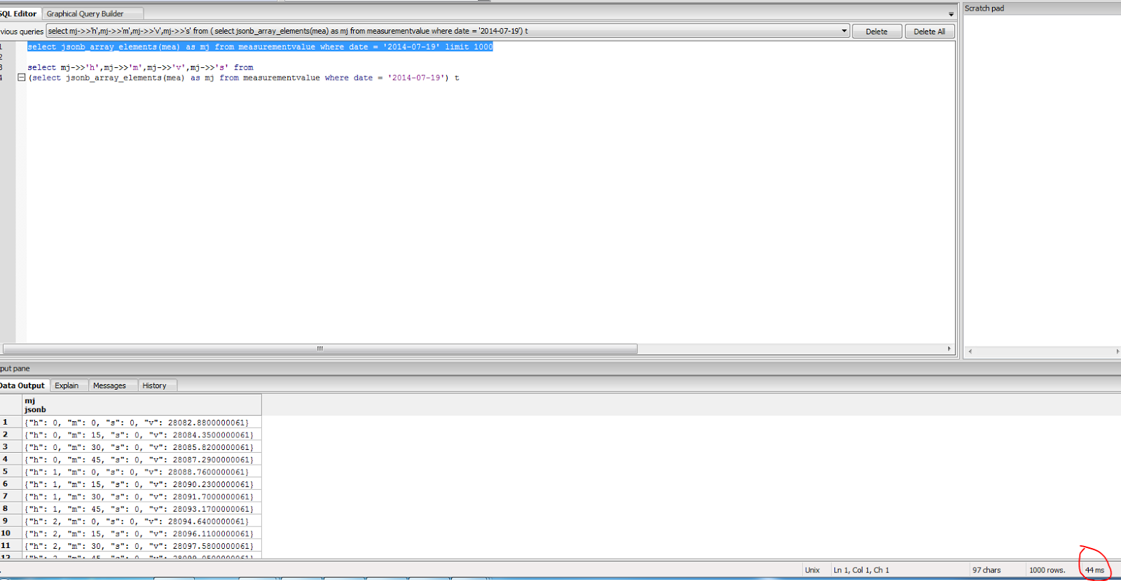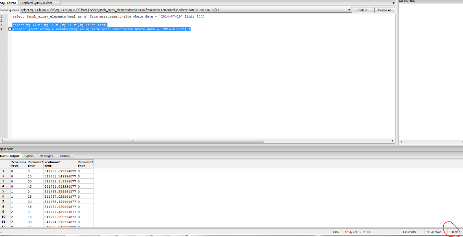OrientDB query: *select mea from MeasurementValue where date = '2014-07-19' unwind mea limit 1000* which takes *12.4 seconds* is equivalent to PostgreSQL query: *select jsonb_array_elements(mea) as mj from measurementvalue where date = '2014-07-19' limit 1000* which takes *44 ms *as you can see in screenshot below. This is 280 times faster! <https://lh3.googleusercontent.com/-c71gjEw_OW0/VcJ3eN_HhmI/AAAAAAAAIAo/aRRD8tfVMMw/s1600/Postgre1.PNG> If I remove limit and also make projection of JSON elements it takes only 920 ms to return over 130.000 rows (second screenshot). Like in MS SQL I haven't created index for date column. <https://lh3.googleusercontent.com/-83FMi3faBxw/VcJ47fes2HI/AAAAAAAAIA0/LoBHjGyHrfQ/s1600/Postgre2.PNG> Regards, Ivan. -- --- You received this message because you are subscribed to the Google Groups "OrientDB" group. To unsubscribe from this group and stop receiving emails from it, send an email to [email protected]. For more options, visit https://groups.google.com/d/optout.