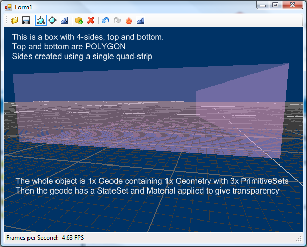 I have a Geode with multiple transparent primitives in it, however one is a box with 4 sides created using QUAD_STRIP and top/bottom created using POLYGON and as such as not coming out quite right. [Image: http://i137.photobucket.com/albums/q217/andyb1979/TransCube.png ] If I create individual QUAD's will this work better? Or perhaps does it have to be individual Geodes to get the sorting working right? Thank you! Andrew ------------------ Read this topic online here: http://forum.openscenegraph.org/viewtopic.php?p=16337#16337 _______________________________________________ osg-users mailing list [email protected] http://lists.openscenegraph.org/listinfo.cgi/osg-users-openscenegraph.org