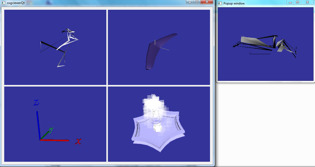 Also could you try running the following in a console: osgconv cow.osgt cow_fromosgt.osg And then post the cow_fromosgt.osg, this might offer some insight in what might be going amiss. You could also try: osgconv cow.osg cow_fromosg.osgt osgviewer cow_fromosg.osgt And: osgconv cow.osg cow_fromosg.osgb osgviewer cow_fromosg.osgb If the binary (.osgb) works and the text (.osgt) version doesn't it would suggest something wrong with the parsing of the text file. In the past we have seen problems with some ascii file loaders with handling different local settings - i.e ten point 1 being 10.1 vs 1,10. The only possibility I can think of is that you have an out of date OpenSceneGraph-Data. Robert. On 23 February 2012 10:03, Chris Blizniak <[email protected]> wrote: > Hi, > > Robert, thank you for your suggestions. I used the svn version and there is > no difference. Now, when I can add some images to my post I included a > screen-shot of 'osgviewerQt', when the two 3D models are not displayed > correctly, these are 'cow' and 'dumptruck', left top and right top windows > respectively. > > [Image: http://obrazki.elektroda.pl/2590187500_1329991217_thumb.jpg ] > (http://obrazki.elektroda.pl/2590187500_1329991217.png) > > Secondly, after building OSG last night, I have noticed that now I cannot > even run the examples showing use of textures, I have problem with > 'osgtexture2d.exe' - this one crashes, 'osgtexture3d.exe' is fine but it > doesn't display the texture, it says only that it could not open files. > > What is the difference between 3d model of 'cessna' and 'cow', why only one > of them is displayed ok. > > Thank you! > > Cheers, > Chris > > ------------------ > Read this topic online here: > http://forum.openscenegraph.org/viewtopic.php?p=45708#45708 > > > > > > _______________________________________________ > osg-users mailing list > [email protected] > http://lists.openscenegraph.org/listinfo.cgi/osg-users-openscenegraph.org _______________________________________________ osg-users mailing list [email protected] http://lists.openscenegraph.org/listinfo.cgi/osg-users-openscenegraph.org