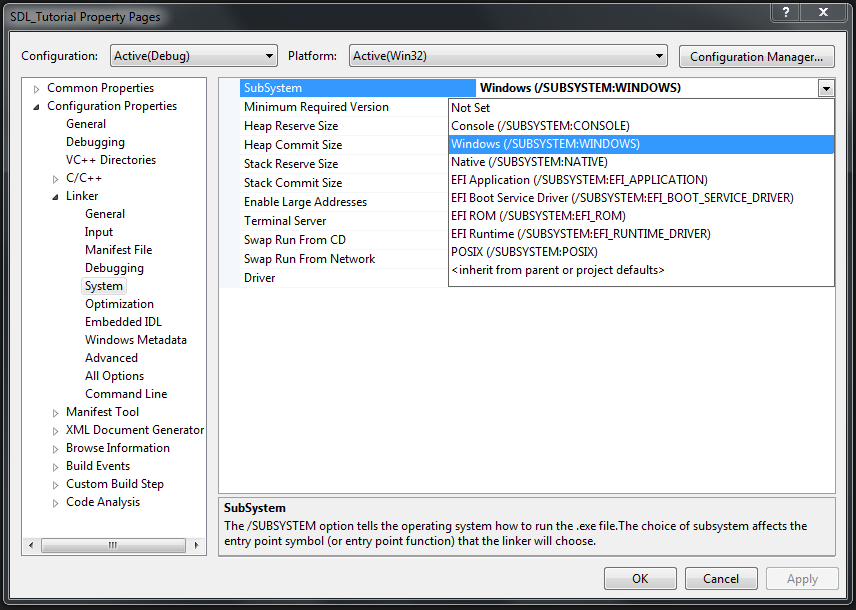 Hi aquawicket I think you need to specify linker subsystem. example: [Image: http://2.bp.blogspot.com/-tuekaUyoTuM/T_uaWBI_NdI/AAAAAAAAAFs/-Dj5Udavim4/s1600/setsubsystem.png ]