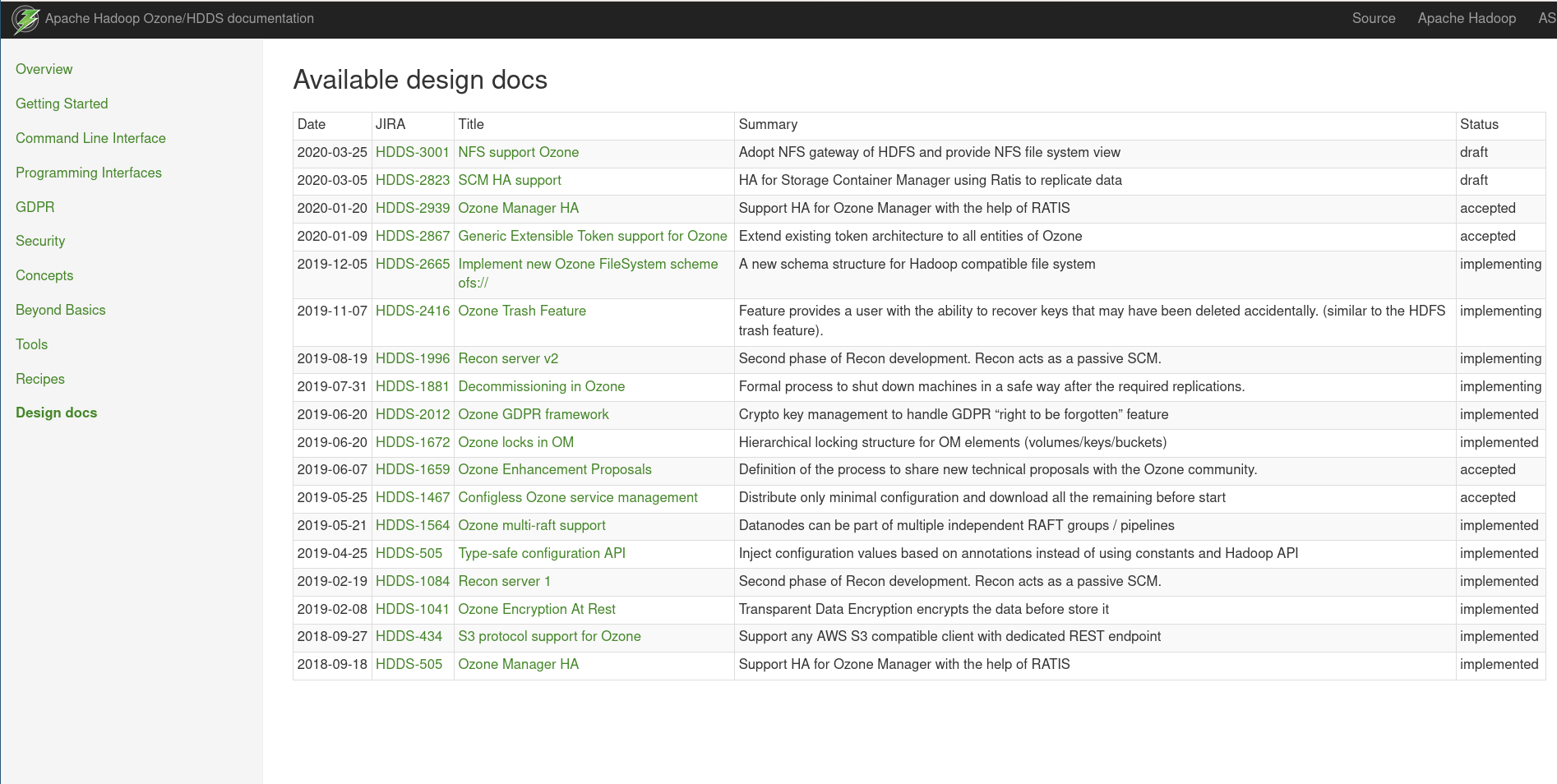 elek opened a new pull request #755: HDDS-3328. List design docs as part of the documentation page. URL: https://github.com/apache/hadoop-ozone/pull/755 ## What changes were proposed in this pull request? In HDDS-1659 a new generic way was introduced to make the design docs more public (collect them as part of the documentation whether they are written as part of the docs or as separated pdf/google docs). This patch: List the design doc as part of the documentation Adds link to some of the existing / earlier design docs I believe that this can be a good extension to the documentation page as some of the low level internals are discussed only in design docs.  ## What is the link to the Apache JIRA https://issues.apache.org/jira/browse/HDDS-3328 ## How was this patch tested? ``` cd hadoop-hdds/docs hugo serve firefox http://localhost:1313 ```