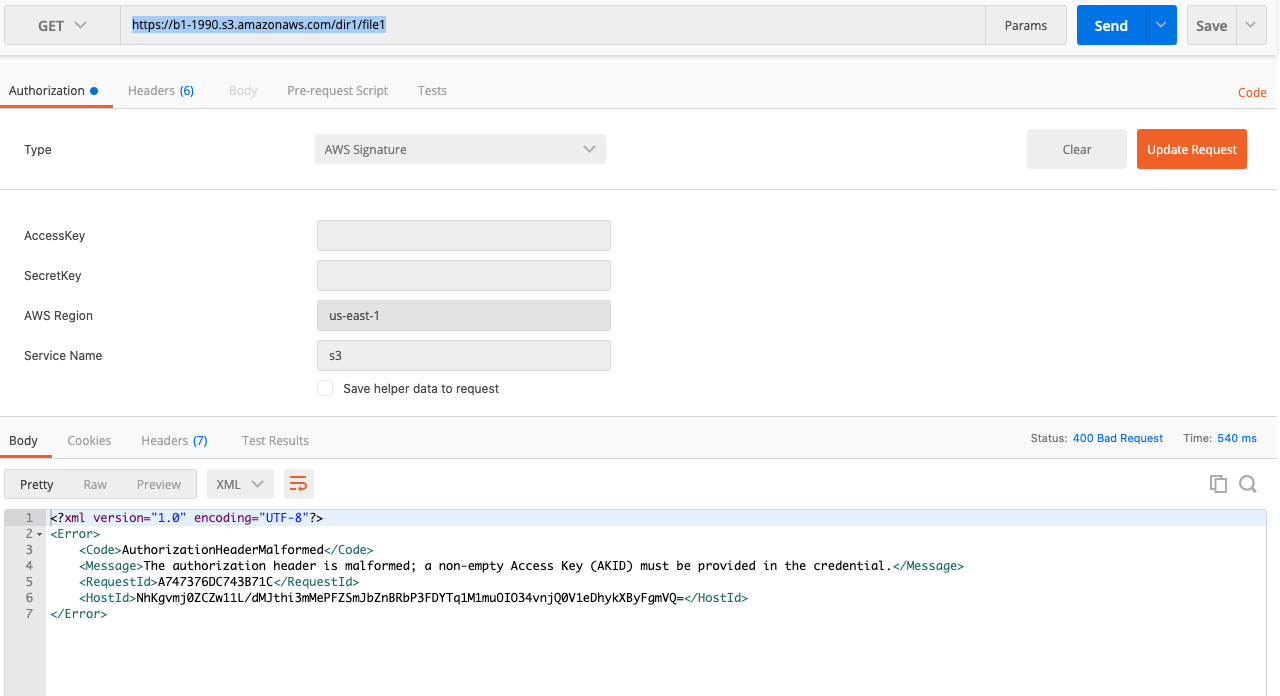 Thank You @maobaolong for the fix and @dineshchitlangia for tagging me. @maobaolong >Start a goofy without Authorization related setting. Can you elaborate this step what do you mean/how to set it up? I checked with the postman(curl tool), by empty access key/secret, the error I see from AWS S3 is as below. In the above step if you mean missing security access key/secret missing, then below is the error. (I have used postman, which generates auth header but missing access key  /secret) ``` <?xml version="1.0" encoding="UTF-8"?> <Error> <Code>AuthorizationHeaderMalformed</Code> <Message>The authorization header is malformed; a non-empty Access Key (AKID) must be provided in the credential.</Message> <RequestId>64890549427133A8</RequestId> <HostId>rcJrOJhmw5P7JuDjs1wE/3GR7XlV7U54lSjtdxn7xBxdCX3wKyZ79ZIIJ30oF2R+CZ5PzOt90Rw=</HostId> </Error> ``` If complete auth header missing, this is the error from AWS S3 ``` $ curl -X GET "https://b1-1990.s3.amazonaws.com/dir1/file1" <?xml version="1.0" encoding="UTF-8"?> <Error><Code>AccessDenied</Code><Message>Access Denied</Message><RequestId>484B292350637469</RequestId><HostId>WKd5J5ytp/GOcindJU+60LNXtbxupzTFj2hjlEQzhTiwZBS3wN86BxvjT5ZBn9uh1eFqGHNMzNo=</HostId></Error>$ ``` ---------------------------------------------------------------- This is an automated message from the Apache Git Service. To respond to the message, please log on to GitHub and use the URL above to go to the specific comment. For queries about this service, please contact Infrastructure at: [email protected] --------------------------------------------------------------------- To unsubscribe, e-mail: [email protected] For additional commands, e-mail: [email protected]