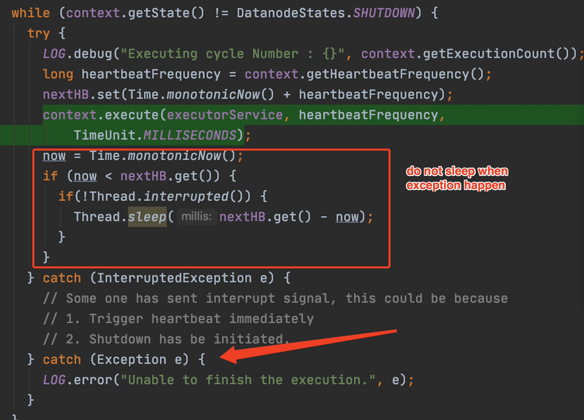@adoroszlai Hi, There is one more comment. The reason of so many logs when NPE happen is when NPE happen, the thread did not sleep and start another while loop immediately. I think we should also avoid this.  ---------------------------------------------------------------- This is an automated message from the Apache Git Service. To respond to the message, please log on to GitHub and use the URL above to go to the specific comment. For queries about this service, please contact Infrastructure at: [email protected] --------------------------------------------------------------------- To unsubscribe, e-mail: [email protected] For additional commands, e-mail: [email protected]