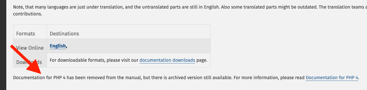 Opened By: nicoSWD Pull Request Description: Hi! I feel like a _red giant warning about PHP 4 documentation_ is not the first thing people should see in 2019 when looking for documentation. I think it's a little less confusing and attention grabbing below the table, like this:  What do you think? (Oh, and there's no such thing as _informations_) -- PHP Webmaster List Mailing List (http://www.php.net/) To unsubscribe, visit: http://www.php.net/unsub.php