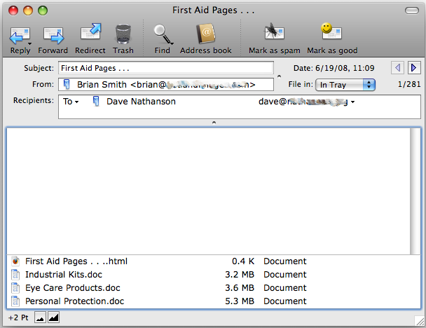 Isn't your HTML showing as an attachment in PowerMail? On Thu, Jun 19, 200812:22 PM, the following words from Dave N [EMAIL PROTECTED], emerged from a plethora of SPAM ...