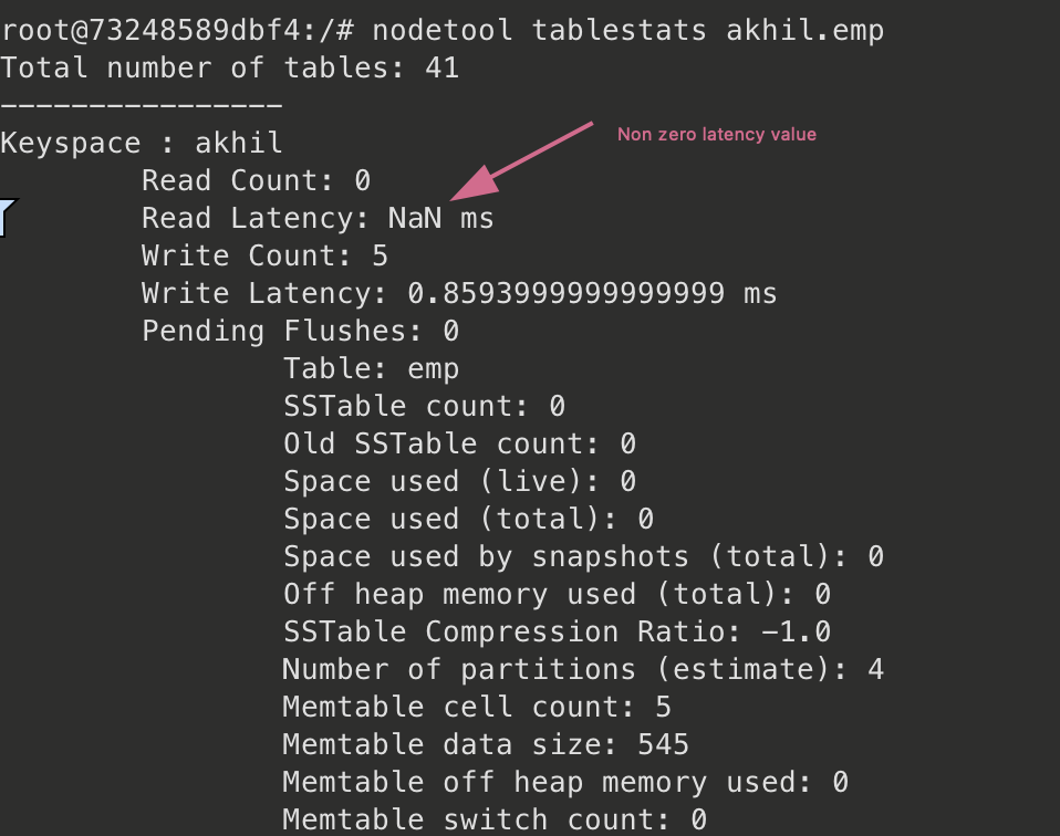 Non zero read/write values was resulting in an incorrect display of latency value in the output of `nodetool tablestats` command. See the sample screenshot uploaded. This patch will display latency value as `0` in case there is no read/write. -- This is an automated message from the Apache Git Service. To respond to the message, please log on to GitHub and use the URL above to go to the specific comment. To unsubscribe, e-mail: [email protected] For queries about this service, please contact Infrastructure at: [email protected] --------------------------------------------------------------------- To unsubscribe, e-mail: [email protected] For additional commands, e-mail: [email protected]