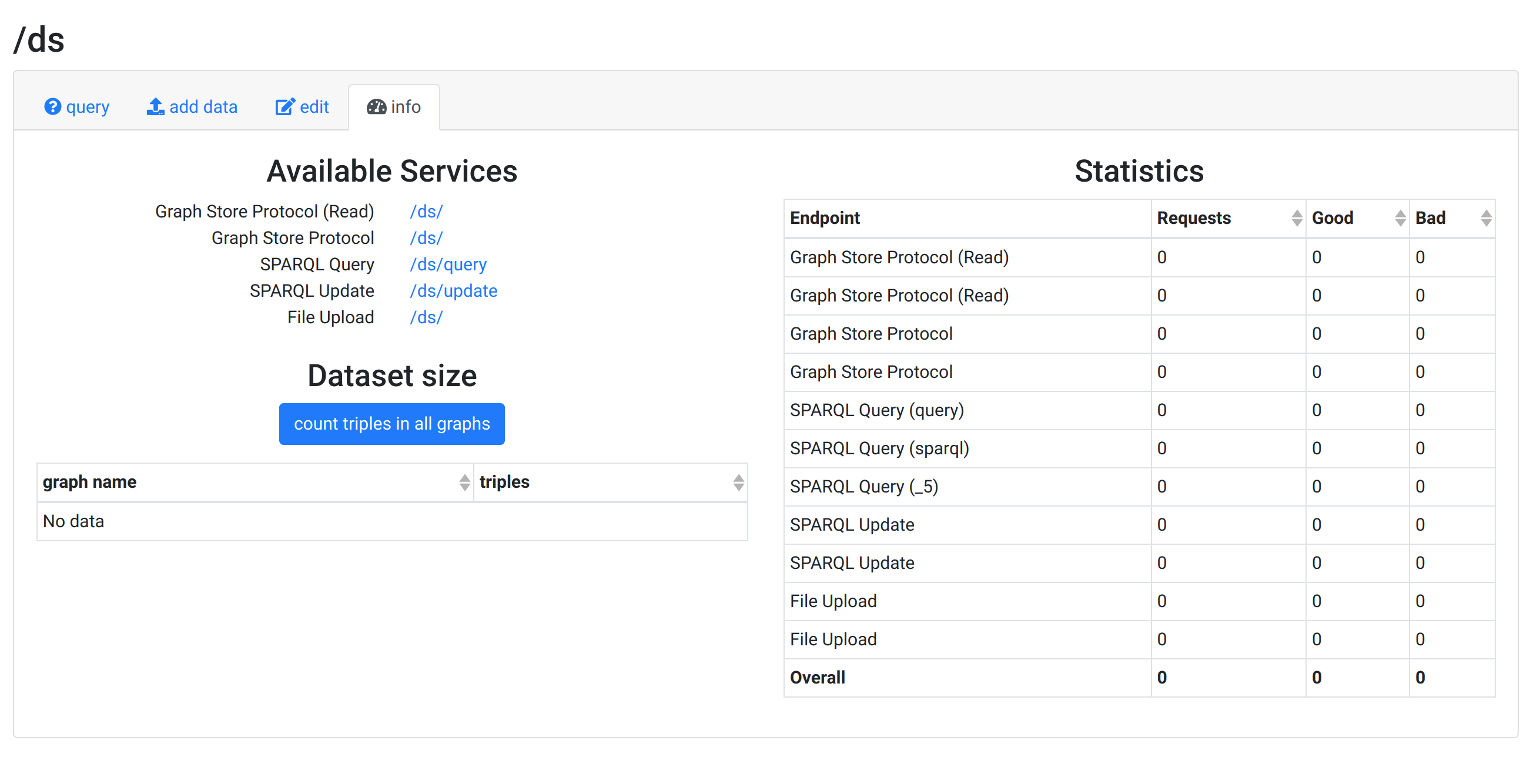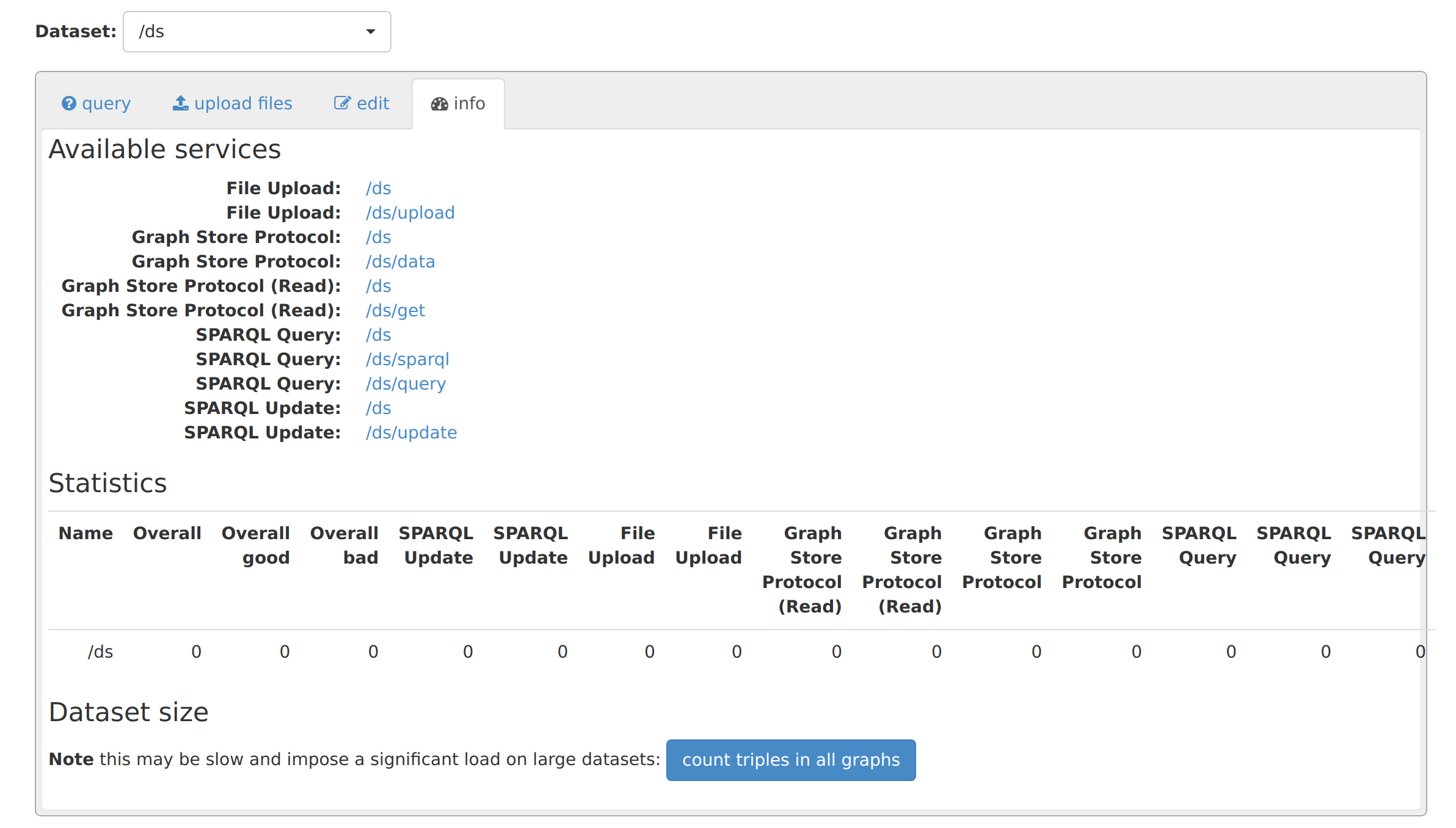 Looking good and the build works. Aside: I see that uploading data is using GSP, not HTML File Upload. That solves the problem of Common FileUpload version - we drop the upload operation! [JENA-2248](https://issues.apache.org/jira/browse/JENA-2248) - [x] On startup: the display has "No datasets created" -- it would be nice to have a link to create one. The old UI had "No datasets - add one" When going into "Manage datasets" is "existing" - could it be "new dataset" if there are none? - [ ] No "home" button. Old UI had the name "Apache Jena Fuseki" in the top bar  - [ ] On "Manage", could we have a "info" link per dataset? - [ ] Creating a dataset: Could we have two choices - memory and persistent, where persistent is TDB2. (Alternatively, have the third choice as TDB1) - [ ] Info/stats page. "Available Service" has one URL per service. It is a random choice of the two available. There are two. Creating say /ds/sparql implicitly creates /ds for query. In the "Statistics", area it shows both. ( Aside: This needs changing (the templates need updating to new configuration style but this release isn't the time to do it. [JENA-2247](https://issues.apache.org/jira/browse/JENA-2247) -- it is not a UI issue ) New:  Old:  -- This is an automated message from the Apache Git Service. To respond to the message, please log on to GitHub and use the URL above to go to the specific comment. To unsubscribe, e-mail: [email protected] For queries about this service, please contact Infrastructure at: [email protected] --------------------------------------------------------------------- To unsubscribe, e-mail: [email protected] For additional commands, e-mail: [email protected]