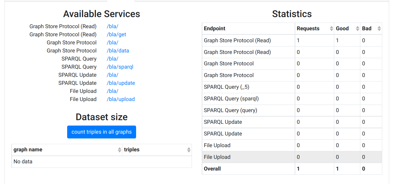 > nfo/stats page. > >"Available Service" has one URL per service. It is a random choice of the two available. There are two. Creating say /ds/sparql implicitly creates /ds for query. > >In the "Statistics", area it shows both. Aaah! We had two operations returned from the server. I remember not understanding why, now I realize they were not the same and it would make sense to display both. Sorry. Fixed!  -- This is an automated message from the Apache Git Service. To respond to the message, please log on to GitHub and use the URL above to go to the specific comment. To unsubscribe, e-mail: [email protected] For queries about this service, please contact Infrastructure at: [email protected] --------------------------------------------------------------------- To unsubscribe, e-mail: [email protected] For additional commands, e-mail: [email protected]