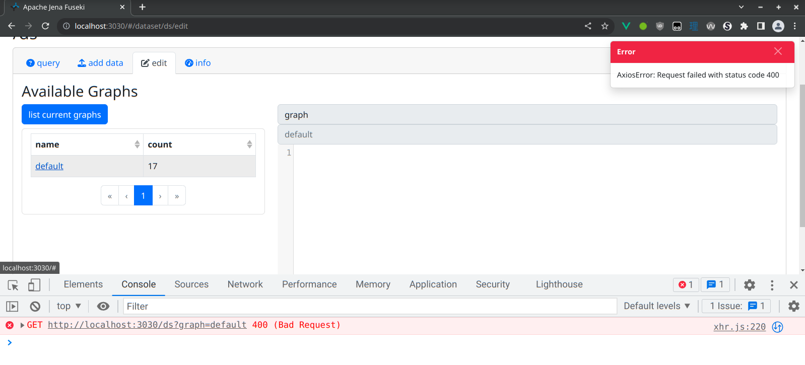 Hi @SimonBin ## This branch Here's what I did: - deleted the branch for this PR, fetched upstream again, checked out this branch (i.e. synced to make sure I'm not missing anything) ``` commit 145ed896680bb9301283792866b0b59132589b3d (HEAD -> pr-1679, edit-data) Author: Simon Bin <[email protected]> Date: Fri Dec 16 00:42:49 2022 +0100 GH-1679: edit not working on non root g-sp ``` - Started Eclipse and started `FusekiCmd`. - Deleted all my datasets. - Created a `ds` dataset TDB2 persisted to disk. - Using the UI, went to Edit, listed graphs, chose the default, edited the graph (on this branch) and loaded the `books.ttl` contents, then saved it. Then I stopped `FusekiCmd` in Eclipse, and opened the `ds.ttl` configuration, `/home/kinow/Development/java/jena/jena/jena-fuseki2/jena-fuseki-webapp/run/configuration/ds.ttl`. >line to remove After removing it, my service configuration is: ```turtle :service_tdb_all rdf:type fuseki:Service ; rdfs:label "TDB2 ds" ; fuseki:dataset :tdb_dataset_readwrite ; fuseki:endpoint [ fuseki:name "query" ; fuseki:operation fuseki:query ] ; fuseki:endpoint [ fuseki:operation fuseki:update ] ; fuseki:endpoint [ fuseki:name "sparql" ; fuseki:operation fuseki:query ] ; fuseki:endpoint [ fuseki:name "get" ; fuseki:operation fuseki:gsp-r ] ; fuseki:endpoint [ fuseki:name "update" ; fuseki:operation fuseki:update ] ; fuseki:endpoint [ fuseki:operation fuseki:query ] ; fuseki:endpoint [ fuseki:name "data" ; fuseki:operation fuseki:gsp-rw ] ; fuseki:name "ds" . ``` Restarting `FusekiCmd` it prints the available services/endpoints: ``` [2022-12-28 12:00:18] Server INFO Configuration file: /home/kinow/Development/java/jena/jena/jena-fuseki2/jena-fuseki-webapp/run/config.ttl [2022-12-28 12:00:18] Server INFO Path = /ds [2022-12-28 12:00:18] Server INFO Operation = query Endpoints = [ "", "query", "sparql" ] [2022-12-28 12:00:18] Server INFO Operation = update Endpoints = [ "", "update" ] [2022-12-28 12:00:18] Server INFO Operation = gsp-rw Endpoints = [ "data" ] [2022-12-28 12:00:18] Server INFO Operation = gsp-r Endpoints = [ "get" ] [2022-12-28 12:00:18] Server INFO System [2022-12-28 12:00:18] Server INFO Memory: 3.8 GiB [2022-12-28 12:00:18] Server INFO Java: 15 [2022-12-28 12:00:18] Server INFO OS: Linux 5.15.0-56-generic amd64 [2022-12-28 12:00:18] Server INFO PID: 24552 ``` I think this is expected, as I have now only the "data" named endpint, `Operation = gsp-rw Endpoints = [ "data" ]`. I re-did the same steps, listing the graphs, loading the contents, and then editing. Everything works fine. ## main branch With the `main` branch, after removing the line you suggested I get an error when I click on the graph name. So I believe I reproduced the issue :slightly_smiling_face: I will try now to understand the fix and see if/how we can write a test for it (over next days, which should be fine as this is for after 4.7.0 - in progress). Thanks!!  -- This is an automated message from the Apache Git Service. To respond to the message, please log on to GitHub and use the URL above to go to the specific comment. To unsubscribe, e-mail: [email protected] For queries about this service, please contact Infrastructure at: [email protected] --------------------------------------------------------------------- To unsubscribe, e-mail: [email protected] For additional commands, e-mail: [email protected]