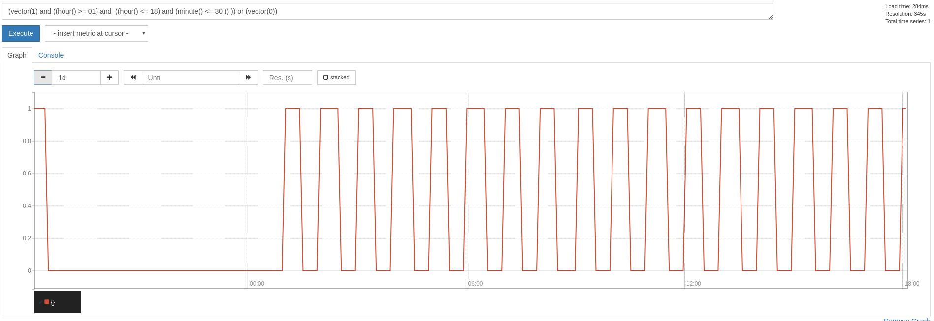 To Filter from 1:00 to 18:30, used the below query (vector(1) and ((hour() >= 01) and ((hour() <= 18) and (minute() <= 30 )) )) or (vector(0)) This gave result as, [image: image] <https://user-images.githubusercontent.com/30234760/75909044-4e86e480-5e71-11ea-9cd2-6a271f10fff1.png> Did you expect to see something different? The query should be giving vector 1 from 1:00 to 18:30, Instead Filters time for every 30 mins, As an alternative tried the below query which doesn`t help, (vector(1) and ((hour() >= 01) and (hour() <= 18.5) )) or (vector(0)) Environment Kubernetes Version: 1.11.6 Prometheus Version: 2.4.3 -- You received this message because you are subscribed to the Google Groups "Prometheus Users" group. To unsubscribe from this group and stop receiving emails from it, send an email to [email protected]. To view this discussion on the web visit https://groups.google.com/d/msgid/prometheus-users/676d9124-07a5-4136-a451-f6c588a4fa93%40googlegroups.com.