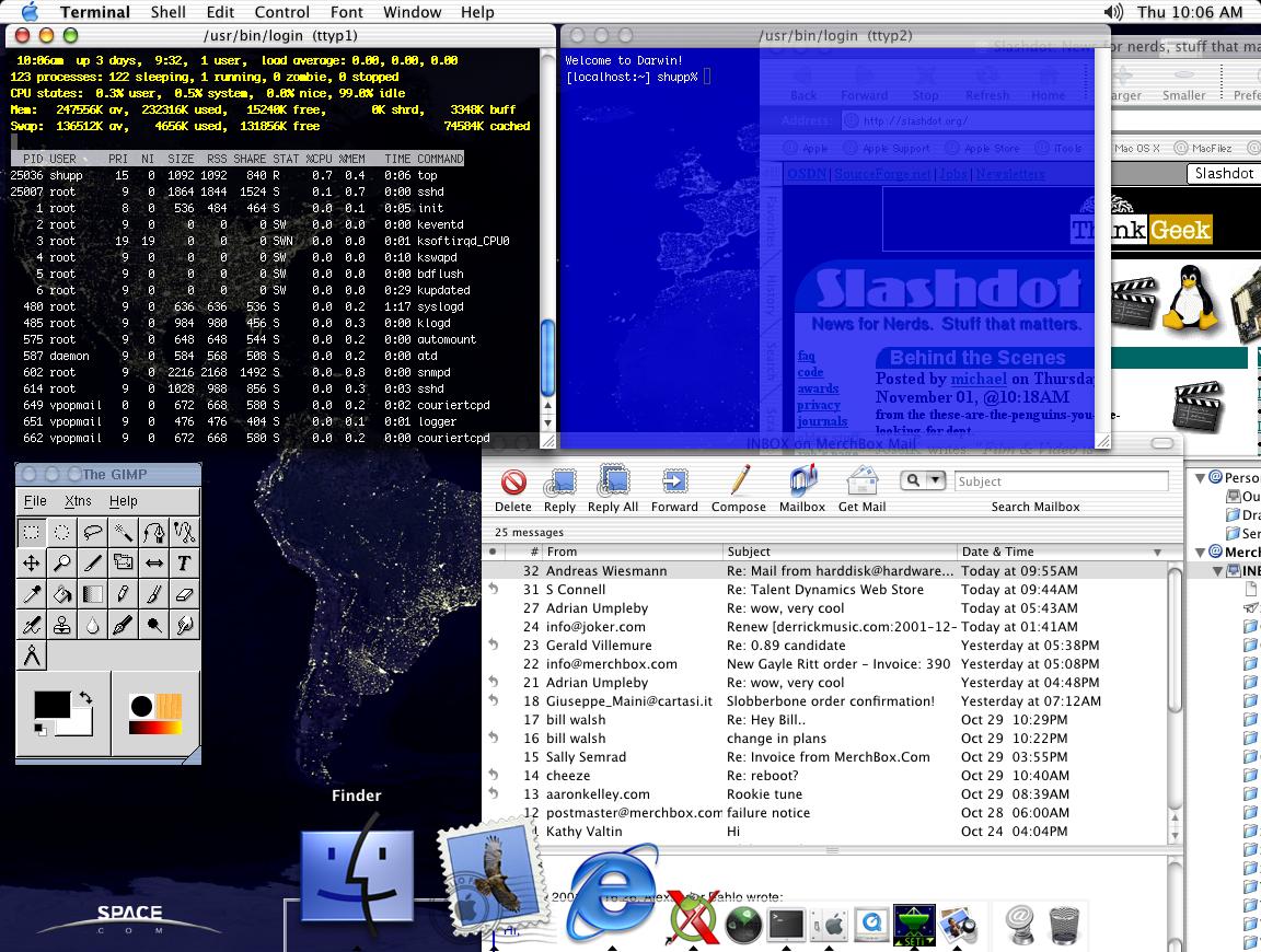 Didn't mean to be snide, just silly. I don't even run Linux as my desktop these days. I've been using OS X (10.1) for a couple of months now. Guess what browser works the best? Yup, IE. (Although it's the only app that crashes under OS X still). Bill P.S. Terminal app has TRUE transparency, unlike Eterm. Very cool, expecially XDarwin (run X alongside Aqua). I put up a screenshot a while ago if you want to see it: http://shupp.org/desktop.jpg