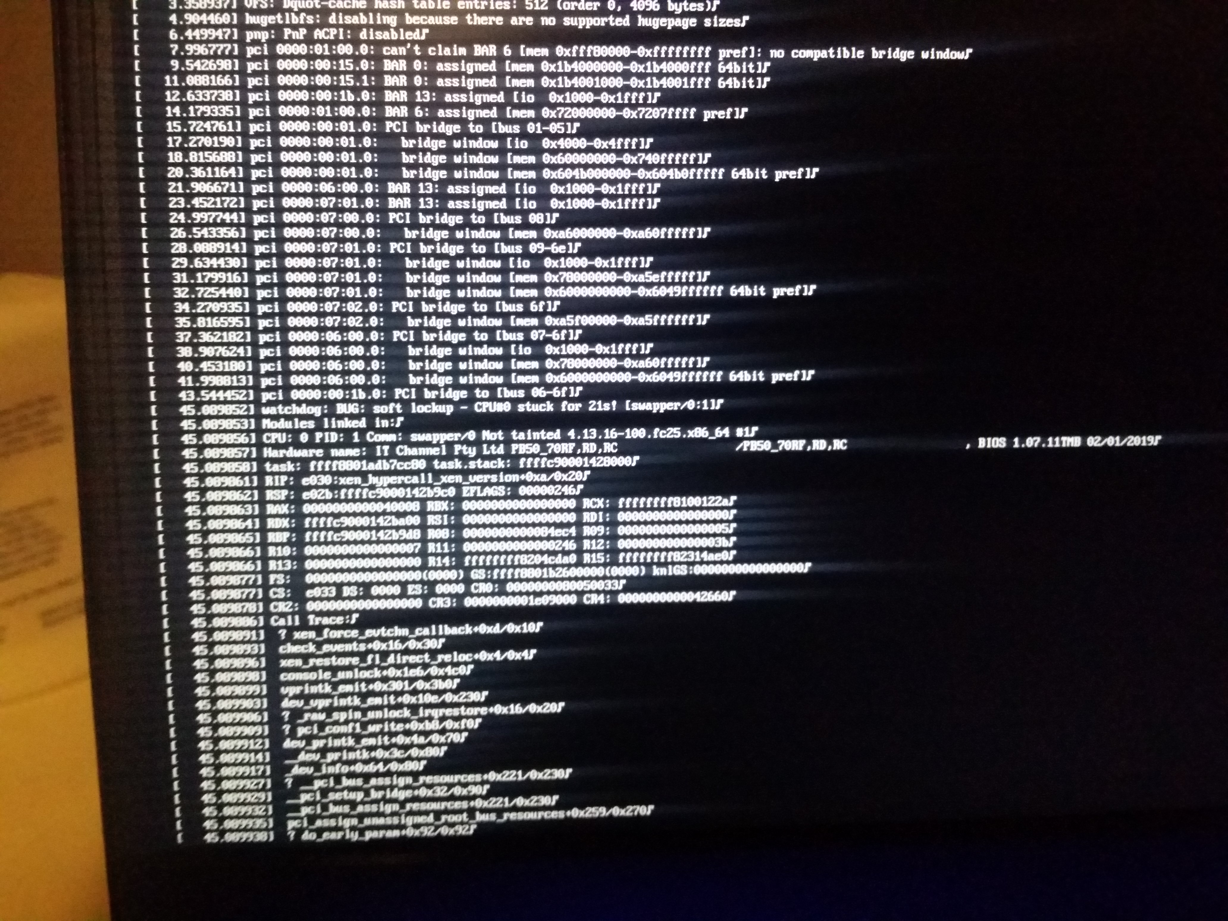 https://user-images.githubusercontent.com/43260698/67632046-025ddf00-f896-11e9-9012-e6813789a3f5.jpg This kernel panic seems to be caused by the interaction of Xen and the iGPU. I can boot Qubes using the Nvidia card or using the iGPU without Xen perfectly fine. Neither of these solutions are usable however, qubes without Xen defeats the purpose and the Nvidia card is not supported by Nouveau. Solutions I have tried so far: - Install from Normal 4.0, 4.0.1 and 4.0.2-rc1 ISO. - Manually create the above isos using Qubes Builder - Install on another machine, fully update the system and install kernel-latest. - Disabling power management (cstates, etc) in both bios and xen/linux boot line. - Hiding the nvidia pci device using `xen-pciback.hide` The following boot configuration has been used: ``` [qubes-verbose] options=console=vga efi=no-rs iommu=no-igfx loglvl=all dom0_mem=min:1024M dom0_mem=max:4096M ucode=scan vga=current,keep guest_loglvl=all #noexitboot=1 #mapbs=1 kernel=vmlinuz inst.stage2=hd:LABEL=Qubes-20190628-x86_64 i915.alpha_support=1 nouveau.modeset=0 iommu=no-igfx console=hvc0 acpi=off ramdisk=initrd.img ``` This has allowed be to gather error messages from the console (see above link). But I have run out of ideas. I've been posting this on the following github issue as well: https://github.com/QubesOS/qubes-issues/issues/5422 Thanks. -- You received this message because you are subscribed to the Google Groups "qubes-users" group. To unsubscribe from this group and stop receiving emails from it, send an email to [email protected]. To view this discussion on the web visit https://groups.google.com/d/msgid/qubes-users/63a8b55f-014d-a32a-d7d3-a58f10ce90e6%40TLRcommunications.com.au.