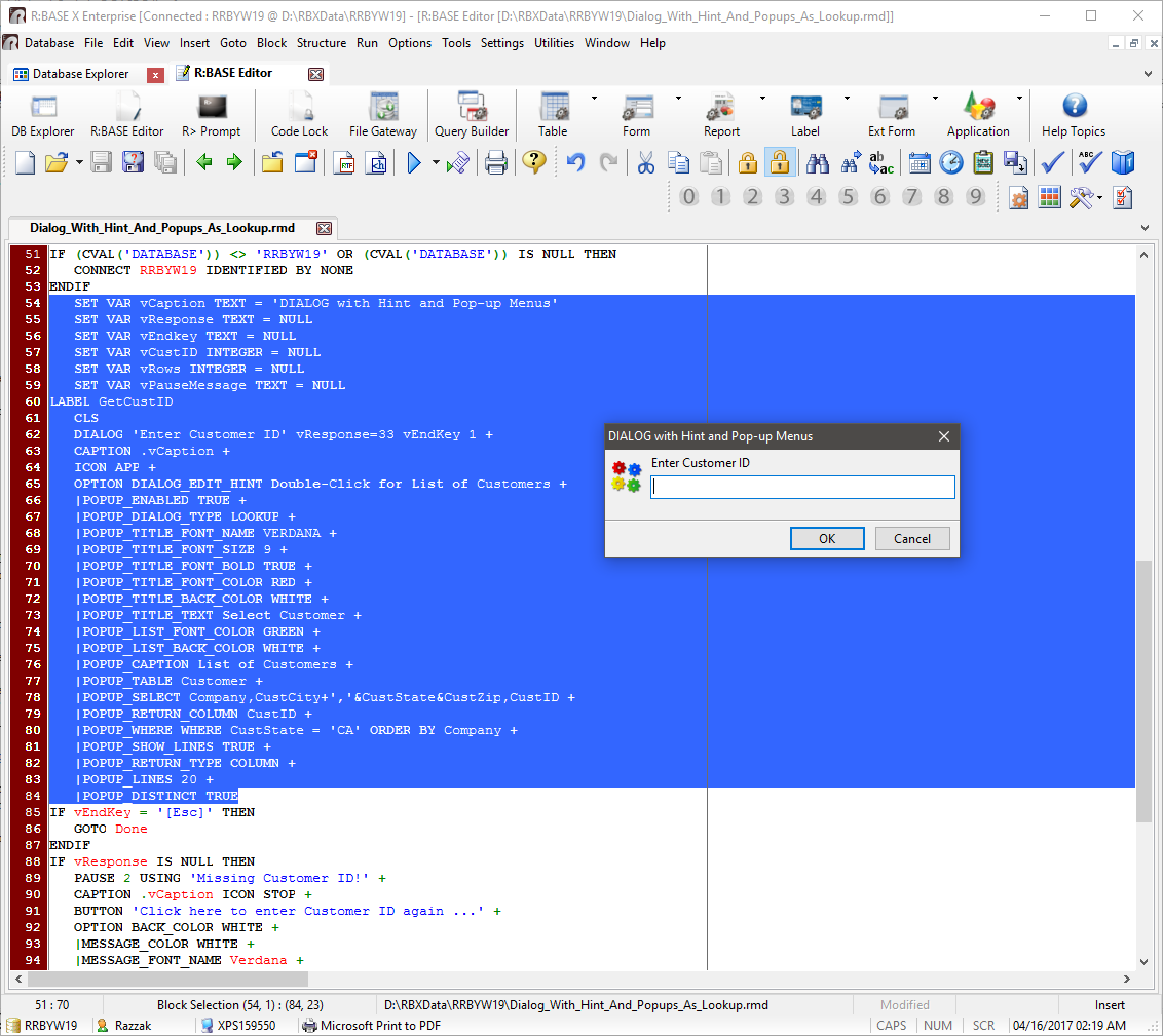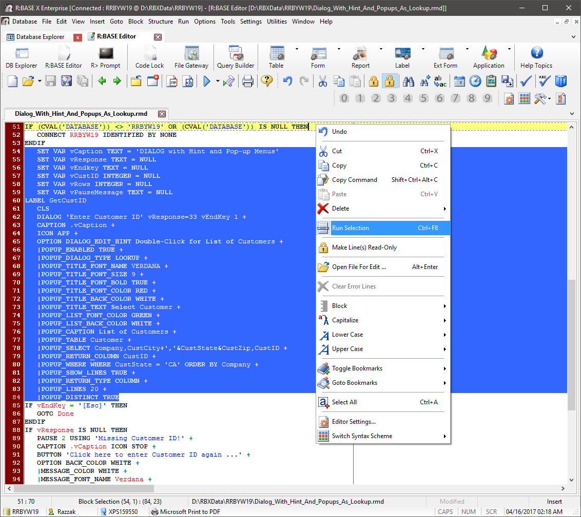 That's darn handy... :) On Monday, April 17, 2017 at 12:01:38 AM UTC-4, A. Razzak Memon wrote: > > Monday, April 17, 2017 > > Tip of the Day: Running Highlighted Code in R:BASE Editor > Product.......: R:BASE X/X Enterprise (Version 10) > Build.........: 10.0.2.20411 or higher > Section.......: R:BASE Editor > Keywords......: Coding, Programming, Run, Command > > Did you know that you can run a highlighted/selected block of code in > the R:BASE Editor? > > The new functionality is extremely helpful, especially if the > specific code is in the > middle (or end) of a command file and you don't want to run the > entire routine from the > beginning. Just, highlight the code, right click and choose "Run > Selection" > > http://www.razzak.com/tips/RBEdit_RunSelection_01.png > http://www.razzak.com/tips/RBEdit_RunSelection_02.png > > The "Run Selection" option is available from the right click > popup > menu, within the > editor "Run" button, and the [Ctrl+F8] key combination. > > Both single line or multi-line code blocks can be highlighted and > executed, to quickly > test programming code. > > The Run Selection functionality is ideal for: > > . Previewing PAUSE and DIALOG commands > . Defining variables > . Creating temporary tables > . Testing a block of code in a large command file > . And more... > > One of the most important aspects in business growth is your company > data, and no one else > has more invested in your success than R:BASE Technologies. Invest > forward with R:BASE! > > Very Best R:egards, > > Razzak. > > www.rbase.com > www.facebook.com/rbase > -- > 34 years of continuous innovation! > 19 Years of R:BASE Technologies, Inc. making R:BASE what it is today! > -- >