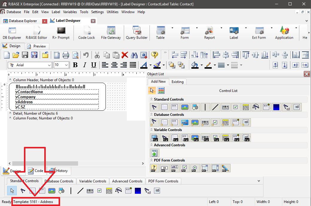 displayed in the bottom left of the Label Designer, when no control