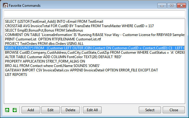 Another winner, Razzak! > On Aug 16, 2017, at 4:07 AM, A. Razzak Memon <[email protected]> wrote: > > Wednesday, August 16, 2017 > > Tip of the Day: Edit List in R> Prompt Command History and Favorites > Product.......: R:BASE X and R:BASE X Enterprise (Version 10) > Build.........: 10.0.2.20731 or higher > Section.......: R> Prompt > Keywords......: Command History, Favorites, Commands > > Did you know there is an option to edit the listed commands within the R> > Prompt's > Command History panel, and Favorite Commands utility? > > The Command History panel allows users to recycle and run entered commands at > the R> > Prompt console. However, the stored results may get cluttered with unwanted > commands > from incorrectly used syntax or other typos. > > Right click within the Command History panel and select "Edit Command > History..." > http://www.razzak.com/tips/CommandHistroy_RightClick.jpg > > The contents of the panel will open into a separate R:BASE Editor window to > delete, > edit, save, etc. the displayed list. > http://www.razzak.com/tips/CommandHistroy_EditCommands.jpg > > The Favorite Commands utility allows users to store and manage commonly used > commands, > and execute the command more easily. > http://www.razzak.com/tips/FavoriteCommands.jpg > > Select the "Edit" button to easily modify the highlighted favorite command. > http://www.razzak.com/tips/EditFavorite.jpg > > So many are the enhancements at the R> Prompt, your productivity at this > powerful > R:BASE mainstay may be suffering if you're not using the full range of > features. > > One of the most important aspects in business growth is your company's data, > and no > one else has more invested in your success than R:BASE Technologies. Invest > forward > with R:BASE! > > Very Best R:egards, > > Razzak. > > www.rbase.com > www.facebook.com/rbase > -- > > -- > For group guidelines, visit > http://www.rbase.com/support/usersgroup_guidelines.php > --- You received this message because you are subscribed to the Google Groups > "RBASE-L" group. > To unsubscribe from this group and stop receiving emails from it, send an > email to [email protected]. > For more options, visit https://groups.google.com/d/optout. > <CommandHistroy_RightClick.jpg><CommandHistroy_EditCommands.jpg><FavoriteCommands.jpg><EditFavorite.jpg>