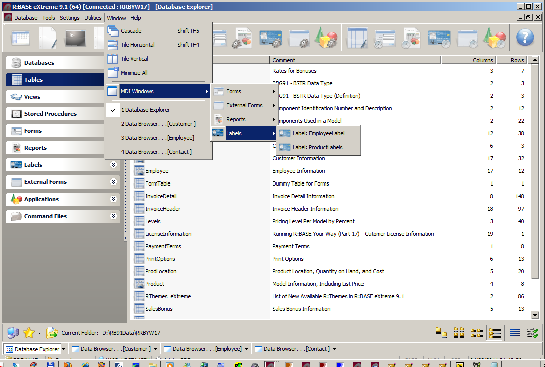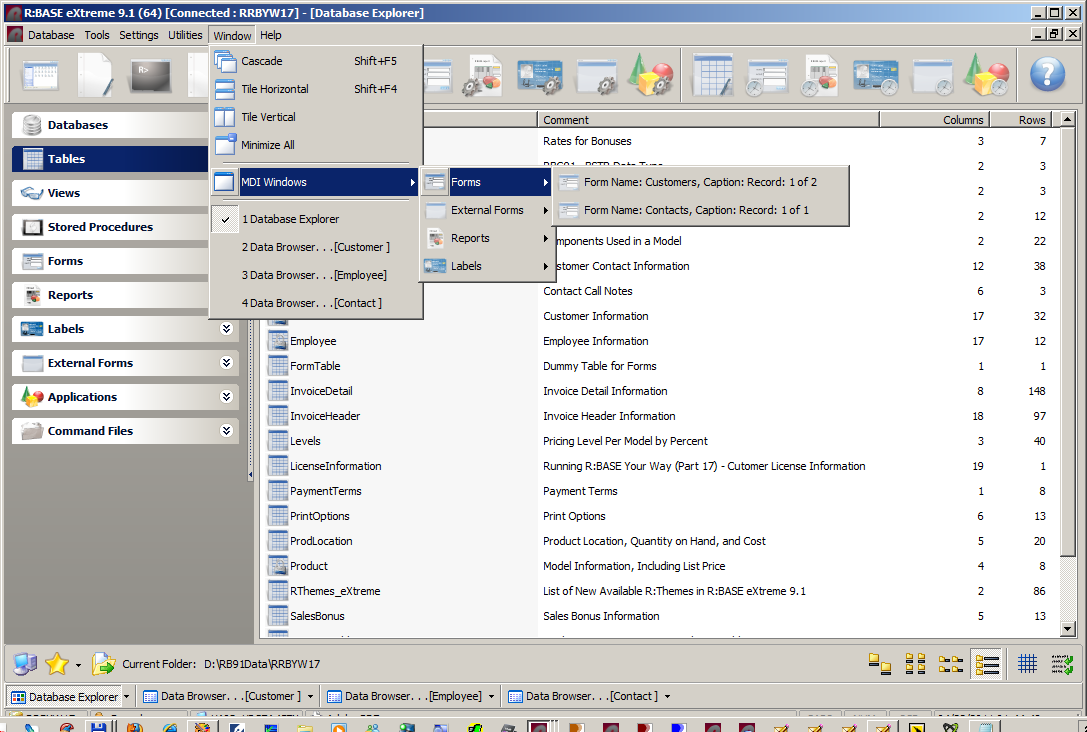 Jan -----Original Message----- From: "A. Razzak Memon" <[email protected]> To: [email protected] (RBASE-L Mailing List) Date: Fri, 22 Apr 2011 02:26:21 -0400 Subject: [RBASE-L] - Tip of the Day: Using MDI Option for Database Explorer Modules Friday, April 22, 2011 Tip of the Day: Using MDI Option for Database Explorer Modules Product: R:BASE eXtreme 9.1 (32/64) Update.: 3 Build..: 9.1.3.10414 or higher http://www.rupdates.com Section: Database Explorer and MDI Options When customizing the settings for Database Explorer, in addition to change the appearance of the Database Explorer window, you may also select the option to "Use Dialog to Open Table/View". Database Explorer | Main Menu | Settings | Database Explorer http://www.razzak.com/tips/DBExplorer_Settings.png Selecting this option toggles the ability to launch a dialog to add a WHERE Clause, change the browse mode, and use an MDI window when opening a table or view. When you double click on a table or view, "Open Table" or "Open View" dialog box is launched and next to the WHERE Builder button an "MDI" check box is available. When MDI option is checked, the Data Browser will be displayed as an MDI windows. You may open as many tables or views at the same time using the MDI option. http://www.razzak.com/tips/DBExplorer_Tables_01.png Did you know that you can use the MDI option when double-clicking on Forms, Reports, Labels, or External Forms to run? Notice the [ ] MDI option next to the [WHERE Builder] button. http://www.razzak.com/tips/DBExplorer_Forms_01.png http://www.razzak.com/tips/DBExplorer_Forms_02.png You may also use the same option for Reports, Labels, and External Forms. There is no limit. However, if you wish to retrieve, switch back to previously opened MDI Browser, Form, Report, Label, External Form , or would like to see a list of all opened MDI windows, you may use the Window option of the Database Explorer. Database Explorer | Main Menu | Window There is where you will see a list of all opened MDI Windows. http://www.razzak.com/tips/DBExplorer_MDI_Windows_01.png http://www.razzak.com/tips/DBExplorer_MDI_Windows_02.png http://www.razzak.com/tips/DBExplorer_MDI_Windows_03.png http://www.razzak.com/tips/DBExplorer_MDI_Windows_04.png This is the R:BASE you have always wanted! Very Best R:egards, Razzak.