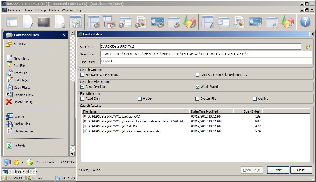 The "Find in Files" utility allows users to locate command files based upon specific text within the files. Two new "Search" options allow the search for text to be more precise. For example, with "Case Sensitive" and "Whole Word" enabled, a search for the command "CONNECT" with no longer return the unwanted results for DISCONNECT or SCONNECT, or any locations where the word "Connect" with lower case letters is used in a DIALOG or PAUSE as the message or caption. Database Explorer | Command Files | Find in Files | Search in File Options [ ] Case Sensitive [ ] Whole Word Example: http://www.razzak.com/tips/Find_In_Files.jpg Search criteria can be modified based on file extensions, case sensitivity, sub-directory searches, and file attributes. After the search is complete, the selected files can be opened in the R:BASE Editor. Stay Productive, My Friends! Very Best R:egards, Razzak. www.razzak.com www.Razzak.com www.RazzakMemon.com