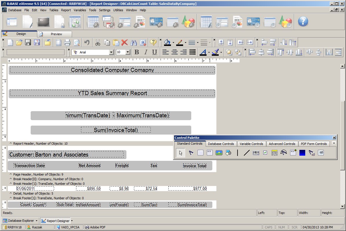 Dennis McGrath Software Developer QMI Security Solutions 1661 Glenlake Ave Itasca IL 60143 630-980-8461 [email protected] -----Original Message----- From: [email protected] [mailto:[email protected]] On Behalf Of A. Razzak Memon Sent: Tuesday, April 30, 2013 11:00 PM To: RBASE-L Mailing List Subject: [RBASE-L] - Tip of the Day: Enabling Consolidated Control Palette inReport Designer Wednesday, May 1, 2013 Tip of the Day: Enabling Consolidated Control Palette in Report/Label Designer Product: R:BASE eXtreme 9.5 (32/64) Build..: 9.5.2.20430 or higher www.rupdates.com Section: Default Settings, Report/Label Designer Did you know that you can consolidate all individual Report/Label Designer Controls, namely Standard Controls, Database Controls, Advanced Controls, Variable Controls, and PDF Form Controls as one consolidated "Control Palette"? The recently released update of R:BASE eXtreme 9.5 (32/64) now includes an optional setting to use Consolidated Control Palette for Report/Label Designer. While in Report/Label designer, if you wish to use consolidated Control Palette, follow the steps below: 01. Start R:BASE eXtreme 9.5 (32/64) and CONNect to database, such as RRBYW18 02. Database Explorer | Main Menu | Settings ... 03. Select Report/Label Designer and click on Default Settings ... Under [General Tab] notice the new option: [ ] Use Consolidated Control Palette http://www.Razzak.com//Tips/ReportDesigner_01.jpg 04. Check the option for [x] Use Consolidated Control Palette http://www.Razzak.com//Tips/ReportDesigner_02.jpg 05. Click on [OK] button to save Default Report/Label Settings 06. Now open any report in Report Designer and notice the newly appeared consolidated Control Palette http://www.Razzak.com//Tips/ReportDesigner_03.jpg You may grab and dock newly appeared consolidated Control Palette anywhere you wish. http://www.Razzak.com//Tips/ReportDesigner_04.jpg Stay productive, my friends! Very Best R:egards, Razzak. www.rbase.com www.facebook.com/rbase www.RazzakMemon.com --- RBASE-L ================================================ TO POST A MESSAGE TO ALL MEMBERS: Send a plain text email to [email protected] (Don't use any of these words as your Subject: INTRO, SUBSCRIBE, UNSUBSCRIBE, SEARCH, REMOVE, SUSPEND, RESUME, DIGEST, RESEND, HELP) ================================================ TO SEE MESSAGE POSTING GUIDELINES: Send a plain text email to [email protected] In the message SUBJECT, put just one word: INTRO ================================================ TO UNSUBSCRIBE: Send a plain text email to [email protected] In the message SUBJECT, put just one word: UNSUBSCRIBE ================================================ TO SEARCH ARCHIVES: Send a plain text email to [email protected] In the message SUBJECT, put just one word: SEARCH-n (where n is the number of days). In the message body, place any text to search for. ================================================
