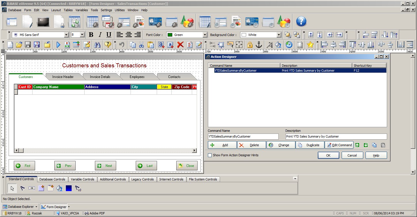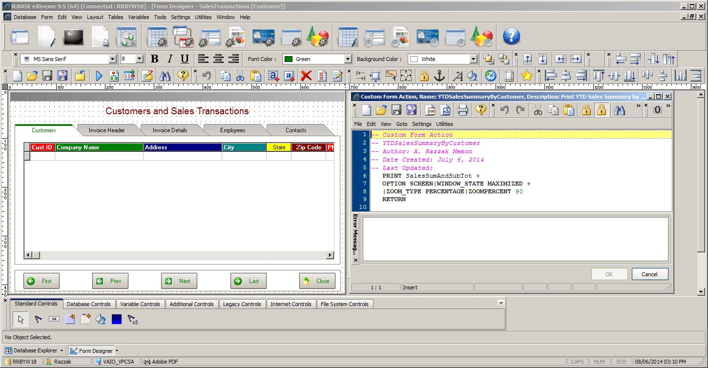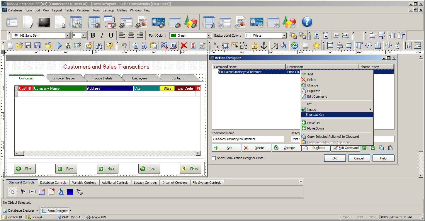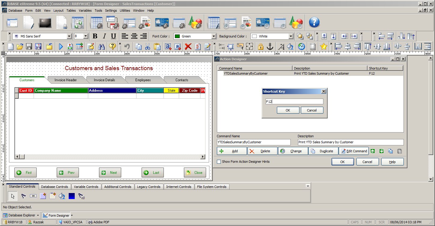 -----Original Message----- From: "A. Razzak Memon" <[email protected]> To: [email protected] (RBASE-L Mailing List) Date: Wed, 06 Aug 2014 15:31:40 -0400 Subject: [RBASE-L] - Re: how to trap function keys in a form At 10:02 AM 8/5/2014, rehan wyne wrote: >Can anyone help, how to trap function keys like F1,F2,F3,... in a form? >My basic idea is to run a user defined form action or call another form >when a application user press a specific function key in the form. >In other words, I want to over ride the built-in functionality of >function keys provided by R:Base. Rehan, Here's how ... 01. Start R:BASE eXtreme 9.5 (32/64), Build: 9.5.4.30821 or higher ... 02. CONNect the database and open the form in Form designer ... For Example: RRBYW18 > Forms > SalesTransactions > Design ... www.razzak.com/tips/DefiningFormShortcutKeys_01.jpg [http://www.razzak.com/tips/DefiningFormShortcutKeys_01.jpg] 03. Now define a Custom Form Action (procedure) that will be assigned a Shortcut Key, such as [F12] to print report. www.razzak.com/tips/DefiningFormShortcutKeys_02.jpg [http://www.razzak.com/tips/DefiningFormShortcutKeys_02.jpg] www.razzak.com/tips/DefiningFormShortcutKeys_03.jpg [http://www.razzak.com/tips/DefiningFormShortcutKeys_03.jpg] 04. Once the Custom Form Action is defined, right-click and select the Shortcut Key www.razzak.com/tips/DefiningFormShortcutKeys_04.jpg [http://www.razzak.com/tips/DefiningFormShortcutKeys_04.jpg] 05. Press any key or key combination to assign Shortcut Key www.razzak.com/tips/DefiningFormShortcutKeys_05.jpg [http://www.razzak.com/tips/DefiningFormShortcutKeys_05.jpg] 06. Let's assign [F12] key by simply pressing on the [F12] key www.razzak.com/tips/DefiningFormShortcutKeys_06.jpg [http://www.razzak.com/tips/DefiningFormShortcutKeys_06.jpg] Click on [OK] button to save Notice the Shortcut Key assigned to Custom Form Action 07. Close the Custom Form Action Designer 08. Preview the Form and then press [F12] key www.razzak.com/tips/DefiningFormShortcutKeys_07.jpg [http://www.razzak.com/tips/DefiningFormShortcutKeys_07.jpg] www.razzak.com/tips/DefiningFormShortcutKeys_08.jpg [http://www.razzak.com/tips/DefiningFormShortcutKeys_08.jpg] Notice the YTD Sales Summary Report .... How cool is that? Very Best R:egards, Razzak. www.rbase.com [http://www.rbase.com/] www.facebook.com/rbase [http://www.facebook.com/rbase] -- 31 years of continuous innovation! 16 Years of R:BASE Technologies, Inc. making R:BASE what it is today! --
