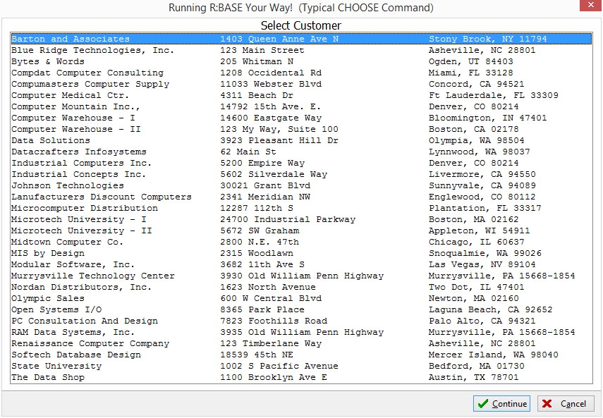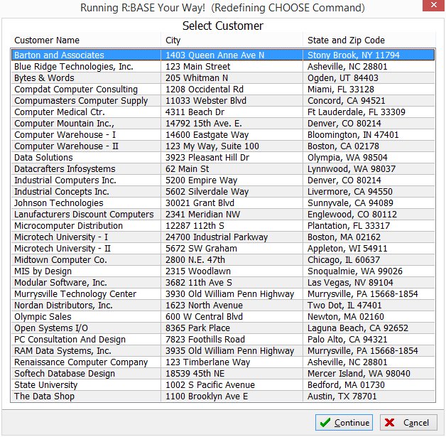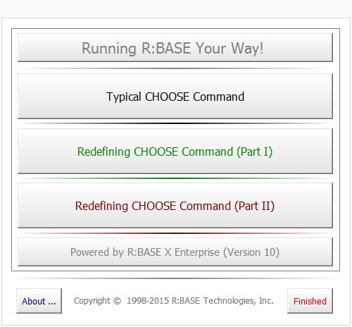 Among so many tools, features, and enhancements in R:BASE X (Version 10), the CHOOSE command has also been enhanced with additional options and parameters. Using R:BASE X (Version 10), now you can customize your typical CHOOSE command to include Zebra Stripes, Horizontal Lines, Vertical Lines, Text Breaks, and Column Headers. Here is an application that illustrates the use of all new options and parameters supported for CHOOSE command. R:BASE Sample Applications: http://www.Razzak.com/SampleApplications/ App Title: Redefining CHOOSE Command - R:BASE X Enterprise Here's a preview for your viewing pleasure ... http://www.razzak.com/tips/Redefining_CHOOSE_Command_01.jpg http://www.razzak.com/tips/Redefining_CHOOSE_Command_02.jpg http://www.razzak.com/tips/Redefining_CHOOSE_Command_03.jpg http://www.razzak.com/tips/Redefining_CHOOSE_Command_04.jpg Please Note: . There are no pre-requisites to install and run this sample application. . There is no need to have any version of R:BASE installed on your computer. . This application is designed to illustrate the use of new CHOOSE command options and parameters. In addition ... . This compiled and fully secured database and self-running application is provided to demonstrate the use of R:Compiler for R:BASE X Enterprise (Version 10) and the suggested method to design, develop, and distribute your compiled applications for mobile devices, such as Tablet PCs. . This complied application also demonstrates the speed of loading your project using R:Compiler for R:BASE X Enterprise (Version 10). . You may install this application in a network and MS Cloud environment to really see the performance and capabilities of R:BASE X Enterprise. . Mobile PC and/or Touch Screen users may also enjoy the new interface. Have fun! Very Best R:egards, Razzak. www.rbase.com www.facebook.com/rbase -- 32 years of continuous innovation! 17 Years of R:BASE Technologies, Inc. making R:BASE what it is today! --