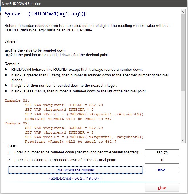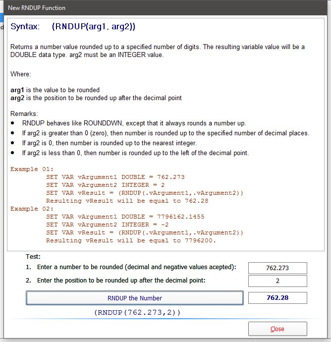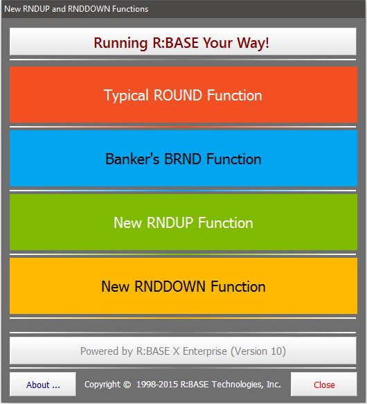 A sample application to illustrate the use of new RNDUP and RNDDOWN functions is now available. R:BASE Sample Applications: http://www.Razzak.com/SampleApplications/ Application Title: Using New RNDUP and RNDDOWN Functions - R:BASE X Enterprise For your viewing pleasure ... http://www.razzak.com/tips/New_RNDUP_And_RNDDOWN_Functions_01.jpg http://www.razzak.com/tips/New_RNDUP_And_RNDDOWN_Functions_02.jpg http://www.razzak.com/tips/New_RNDUP_And_RNDDOWN_Functions_03.jpg http://www.razzak.com/tips/New_RNDUP_And_RNDDOWN_Functions_04.jpg http://www.razzak.com/tips/New_RNDUP_And_RNDDOWN_Functions_05.jpg Please Note: . This application is designed to illustrate the use of new RDNUP and RDNDOWN Functions in R:BASE X and R:BASE X Enterprise (Version 10). . There are no pre-requisites to install and run this sample application. . There is no need to have any version of R:BASE installed on your computer. In addition ... . This compiled and fully secured database and self-running application is provided to demonstrate the use of R:Compiler for R:BASE X Enterprise (Version 10) and the suggested method to design, develop, and distribute your compiled applications for mobile devices, such as Tablet PCs. . This complied application also demonstrates the speed of loading your project using R:Compiler for R:BASE X Enterprise (Version 10). . You may install this application in a network and MS Cloud environment to really see the performance and capabilities of R:BASE X Enterprise. . Mobile PC and/or Touch Screen users may also enjoy the new interface. Have fun! Very Best R:egards, Razzak.