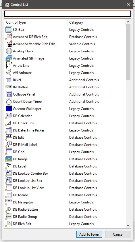 While in Form Designer ... Did you know that you can access the control list by pressing [Ctrl+Alt+P] keys? Then, you can see a complete list of all available controls, including the option to search, as well as selecting the object to Add To Form. For your viewing pleasure ... http://www.razzak.com/tips/RBGX_Accessing_Control_List_In_Form_Designer.jpg Very Best R:egards, Razzak. www.rbase.com www.facebook.com/rbase