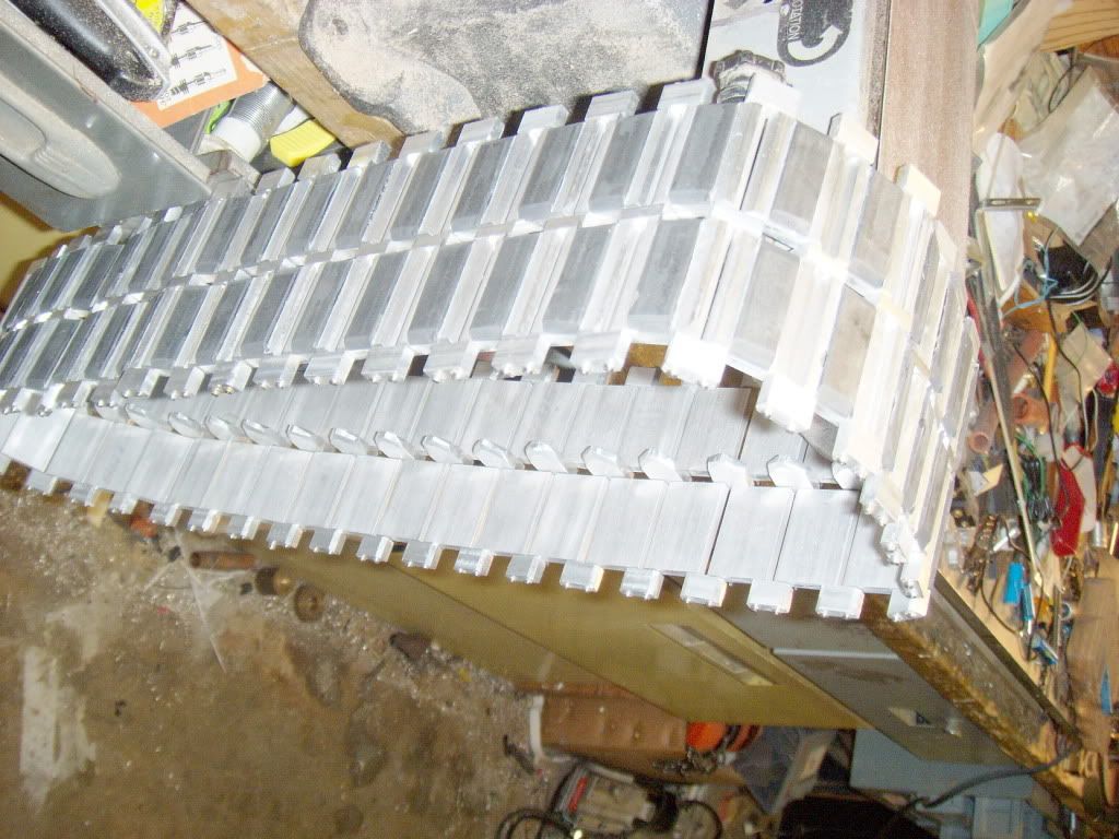 Working on my metal tracks. I have 5 feet assembled and most of the parts built for another 13 feet. I have: 340 aluminum track segments with rubber pads. 340 drive lugs 100 stainless steel pins (need to build another 230) 80 track guides (need to build another 80)