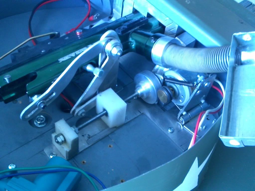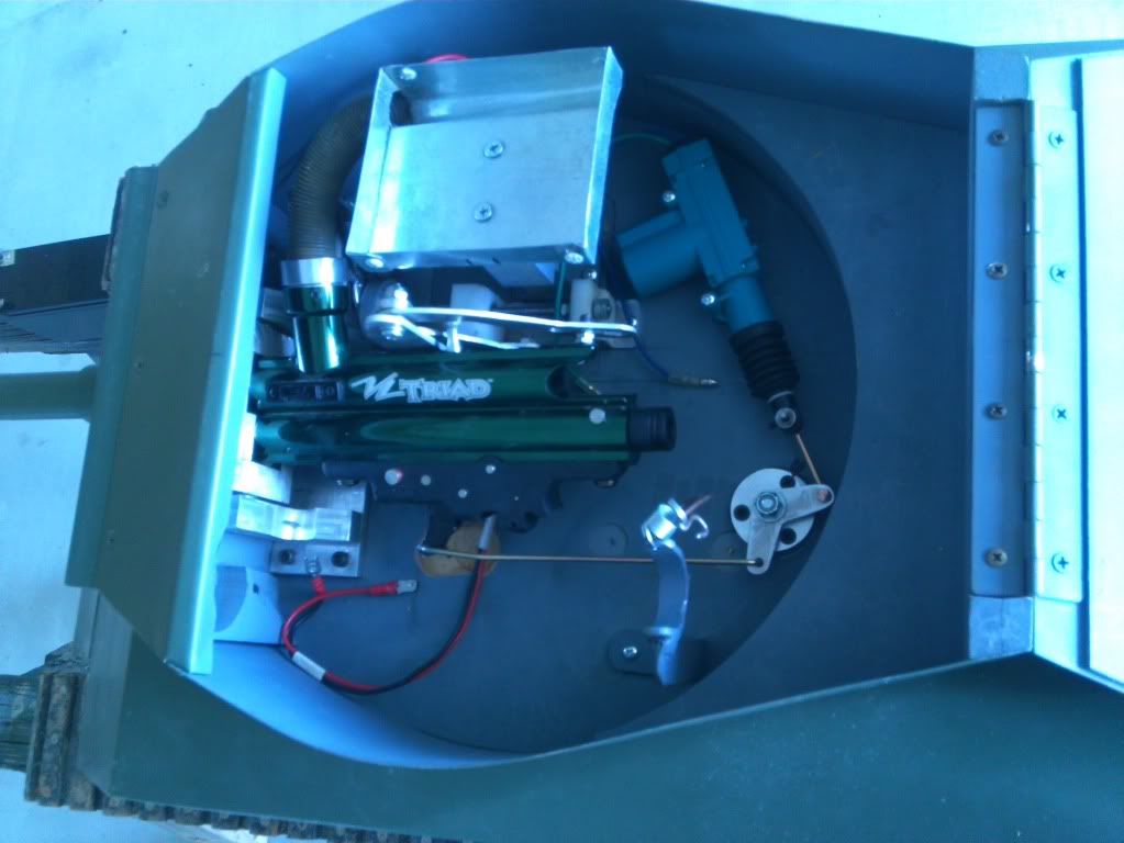 http://i752.photobucket.com/albums/xx165/cobra9431/IMG_0104.jpg The motor (right most) friction drives the threaded shaft, which moves the white nylon block back and forth, which in turn raises and lowers the arm that is shaped oddly enough as to avoid obstructing the charging pin on the markers bolt. Other than some issues with the mechanism binding up when raised or lowered fully, it worked great. http://i752.photobucket.com/albums/xx165/cobra9431/IMG_0102.jpg Above is the interior of the turret including the 30rnd hopper + 9 in the spring (feed tube) + 1 in the chamber for a total of 40rnds. Also there is the door lock actuator operating in tandem with a pivoting mechanism for trigger pull. And at the bottom of the photo is the mounting bracket for the 9oz CO2 bottle which reqires a almost too long coiled air hose (not pictured) to run the compressed gas back to the marker. http://s752.photobucket.com/albums/xx165/cobra9431/?action=view¤t=MOV_0115.mp4 A video is of course in order to show how well it all comes together. At the moment the whole tank is running only on 12 volt, which accounts for the slow speeds of the turret rotation, marker elevation, track speeds...................... well, just about everything. New bigger batteries are soon to be ordered to handle the increased duty load of a 24v upgrade. Aaron F SCAB T076 -- You are currently subscribed to the "R/C Tank Combat" group. To post a message, send email to [email protected] To unsubscribe, send email to [email protected] Visit the group at http://groups.google.com/group/rctankcombat