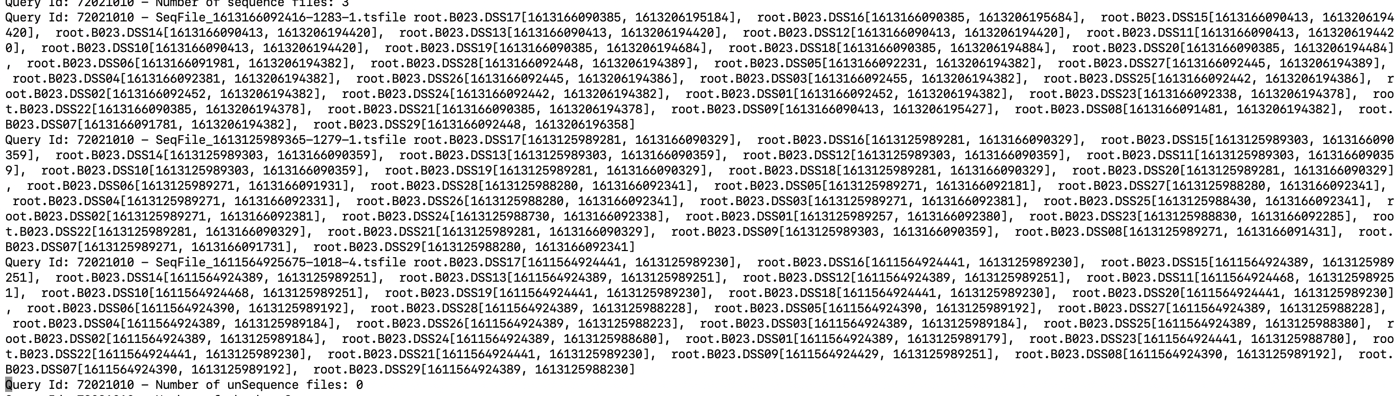 Currently, the tracing log looks like this:  The information of tsfile resource is too much. It's better to remove the time range of each device. ---------------------------------------------------------------- This is an automated message from the Apache Git Service. To respond to the message, please log on to GitHub and use the URL above to go to the specific comment. For queries about this service, please contact Infrastructure at: [email protected]