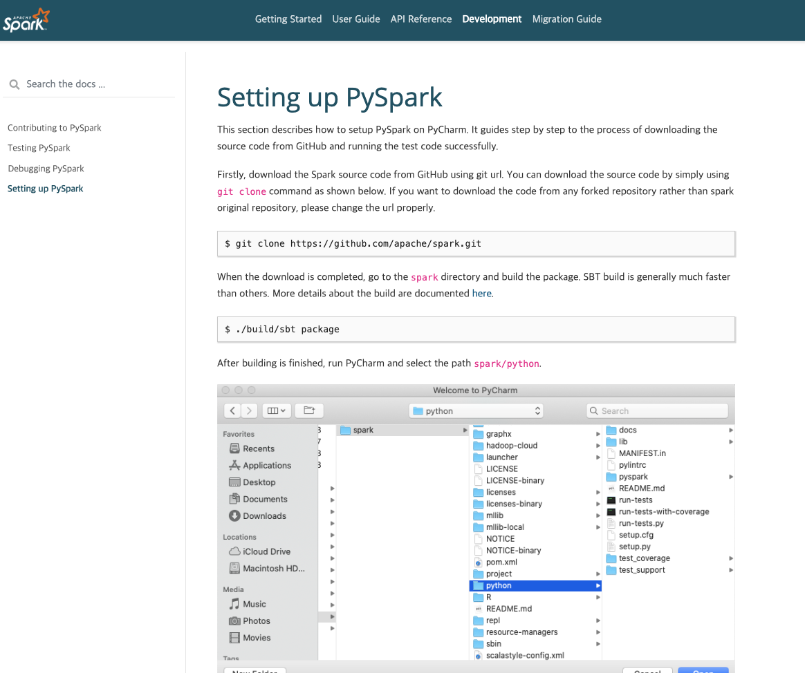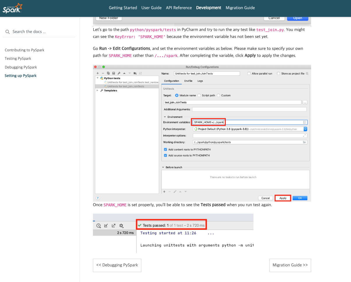 ### What changes were proposed in this pull request? This PR proposes to document the way of setting PySpark with PyCharm.   ### Why are the changes needed? To let users know how to setup PySpark with PyCharm. ### Does this PR introduce _any_ user-facing change? Yes, it adds a new page in the documentation about setting PySpark. ### How was this patch tested? Manually built the doc. ---------------------------------------------------------------- This is an automated message from the Apache Git Service. To respond to the message, please log on to GitHub and use the URL above to go to the specific comment. For queries about this service, please contact Infrastructure at: [email protected] --------------------------------------------------------------------- To unsubscribe, e-mail: [email protected] For additional commands, e-mail: [email protected]