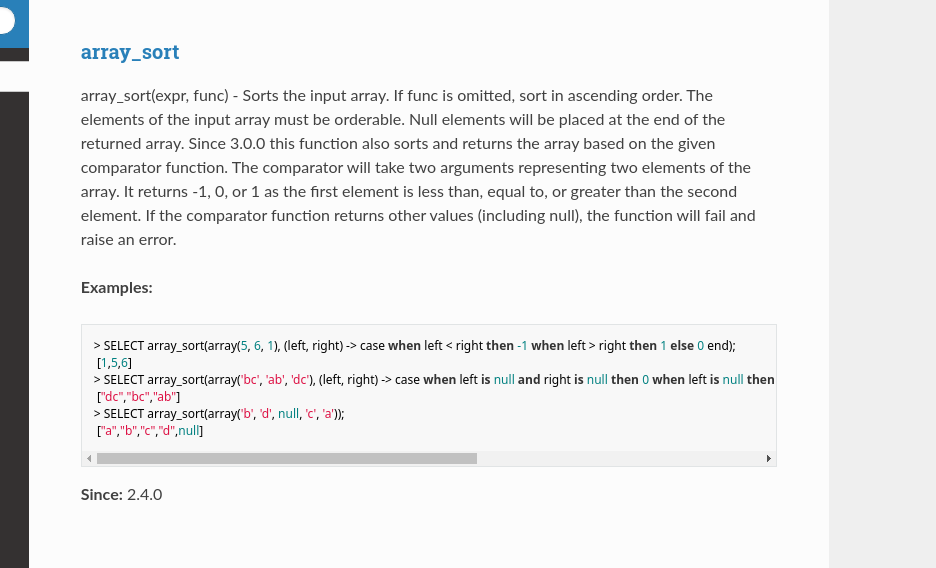 @maropu , I did the first steps, but I need some extra input. It seems, that the `sql-ref-functions-builtin.html` needs some redesign, for longer examples it looks quite bad:  The one in SQL reference looks much better (although here is no grouping):  ---------------------------------------------------------------- This is an automated message from the Apache Git Service. To respond to the message, please log on to GitHub and use the URL above to go to the specific comment. For queries about this service, please contact Infrastructure at: [email protected] --------------------------------------------------------------------- To unsubscribe, e-mail: [email protected] For additional commands, e-mail: [email protected]