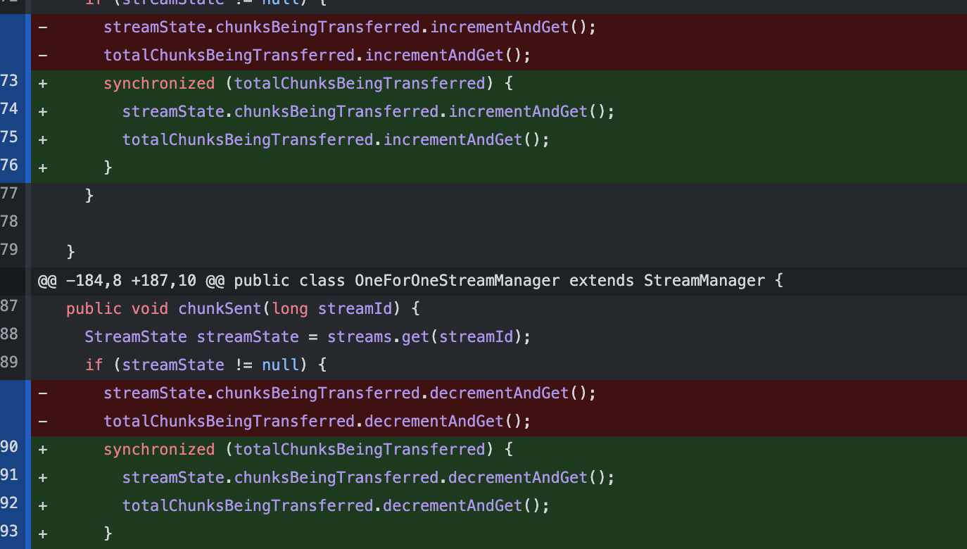 > IMO, we can add a lock to keep strong consistence of value `totalChunksBeingTransferred`, such as >  > > And I have run the test in desc, this change has little effect on performance. WDYT? This should have a considerable impact on the performance when there are multiple open streams because updates of different streams would lock on `totalChunksBeingTransferred`? ---------------------------------------------------------------- This is an automated message from the Apache Git Service. To respond to the message, please log on to GitHub and use the URL above to go to the specific comment. For queries about this service, please contact Infrastructure at: [email protected] --------------------------------------------------------------------- To unsubscribe, e-mail: [email protected] For additional commands, e-mail: [email protected]