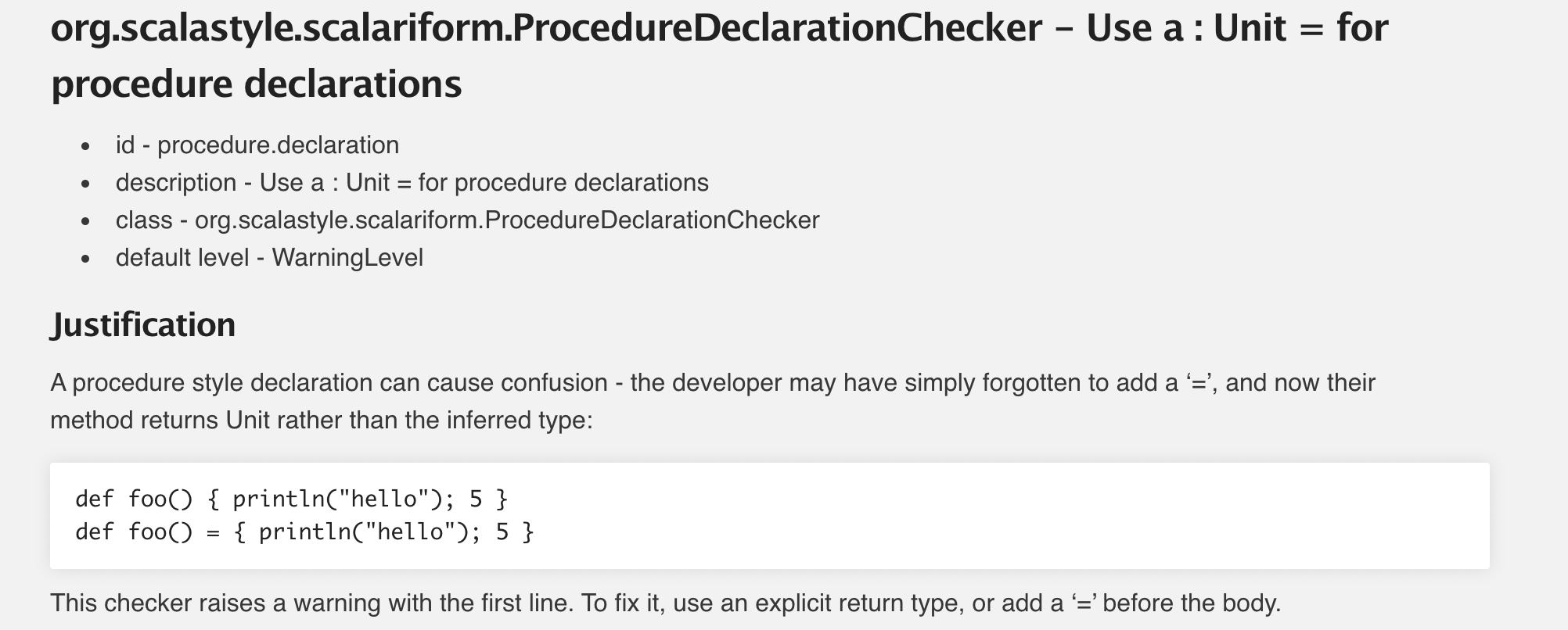 https://github.com/scalastyle/scalastyle/blob/ec14399543d2d5ccf93c3713aa5df21793844791/src/main/scala/org/scalastyle/scalariform/ProcedureDeclarationChecker.scala#L17-L35 ``` package org.scalastyle.scalariform import scalariform.lexer.Tokens class ProcedureDeclarationChecker extends AbstractSingleMethodChecker[Unit] { val errorKey = "procedure.declaration" protected def matchParameters() = Unit protected def matches(t: FullDefOrDclVisit, p: Unit) = { (t.funDefOrDcl.nameToken.text != "this") && (t.funDefOrDcl.funBodyOpt match { // match if we don't have a body, and there is no return type case None => t.funDefOrDcl.returnTypeOpt.isEmpty // match if we do have a body, and the first character is not equals case Some(x) => x.tokens.nonEmpty && x.tokens.head.tokenType != Tokens.EQUALS case _ => false }) } } ```  I think `ProcedureDeclarationChecker` can help us to discover new compilation warnings about `procedure syntax is deprecated`, but it can't check constructor methods now ---------------------------------------------------------------- This is an automated message from the Apache Git Service. To respond to the message, please log on to GitHub and use the URL above to go to the specific comment. For queries about this service, please contact Infrastructure at: [email protected] --------------------------------------------------------------------- To unsubscribe, e-mail: [email protected] For additional commands, e-mail: [email protected]