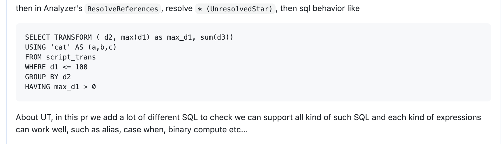 > It seems the current title and description say nothing about the improvement corresponding to the test part: https://github.com/apache/spark/pull/29087/files#diff-aad906f4075c4a48e53758e3e23d62a4d1afa57f8e5a90a892dc026a1478c877R193-R221 ? The title might be `Support projection, aggregate/window functions, and lateral view in the TRANSFORM clause`? Ur...  ---------------------------------------------------------------- This is an automated message from the Apache Git Service. To respond to the message, please log on to GitHub and use the URL above to go to the specific comment. For queries about this service, please contact Infrastructure at: [email protected] --------------------------------------------------------------------- To unsubscribe, e-mail: [email protected] For additional commands, e-mail: [email protected]