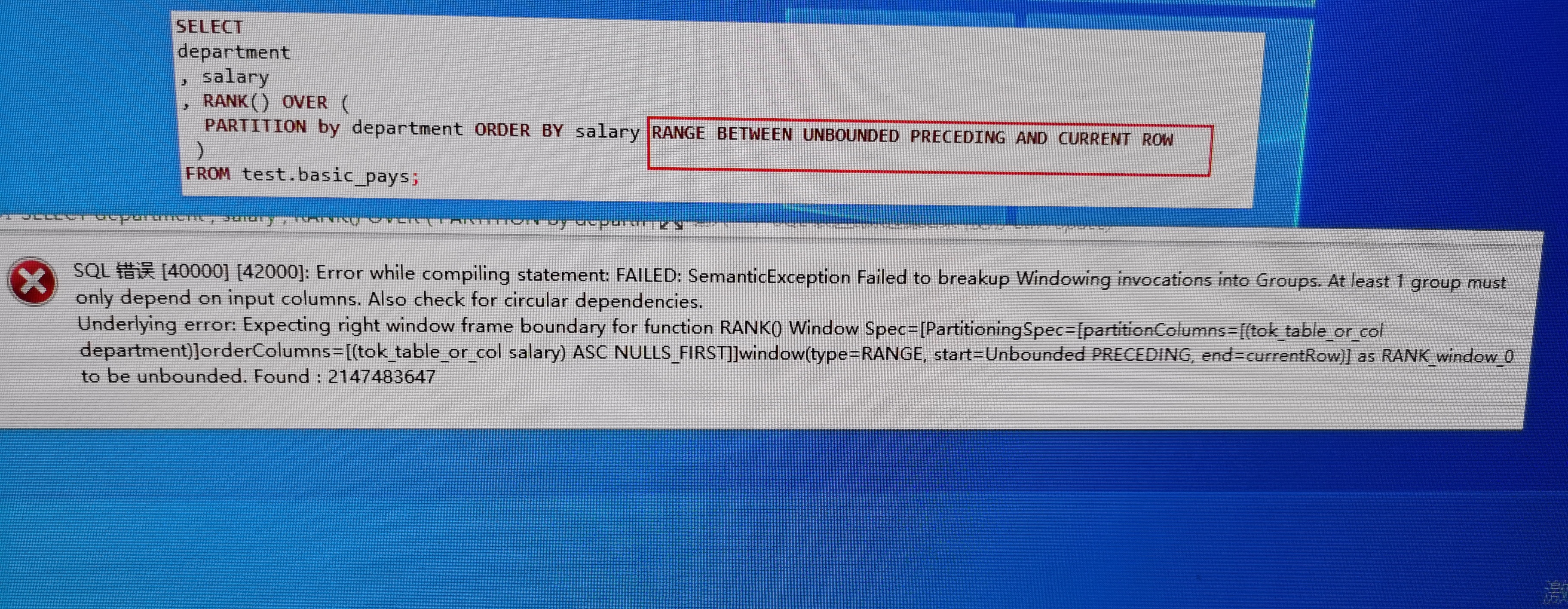 PARTITION by department ORDER BY salary RANGE BETWEEN UNBOUNDED PRECEDING