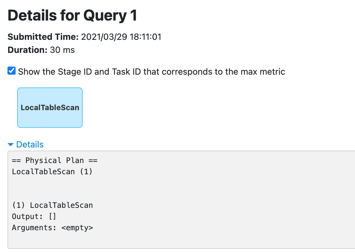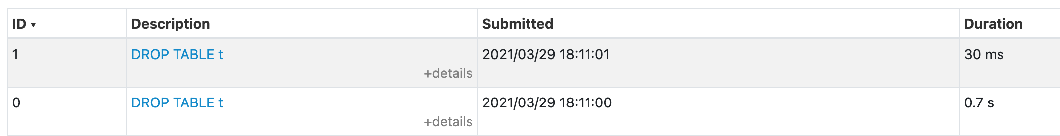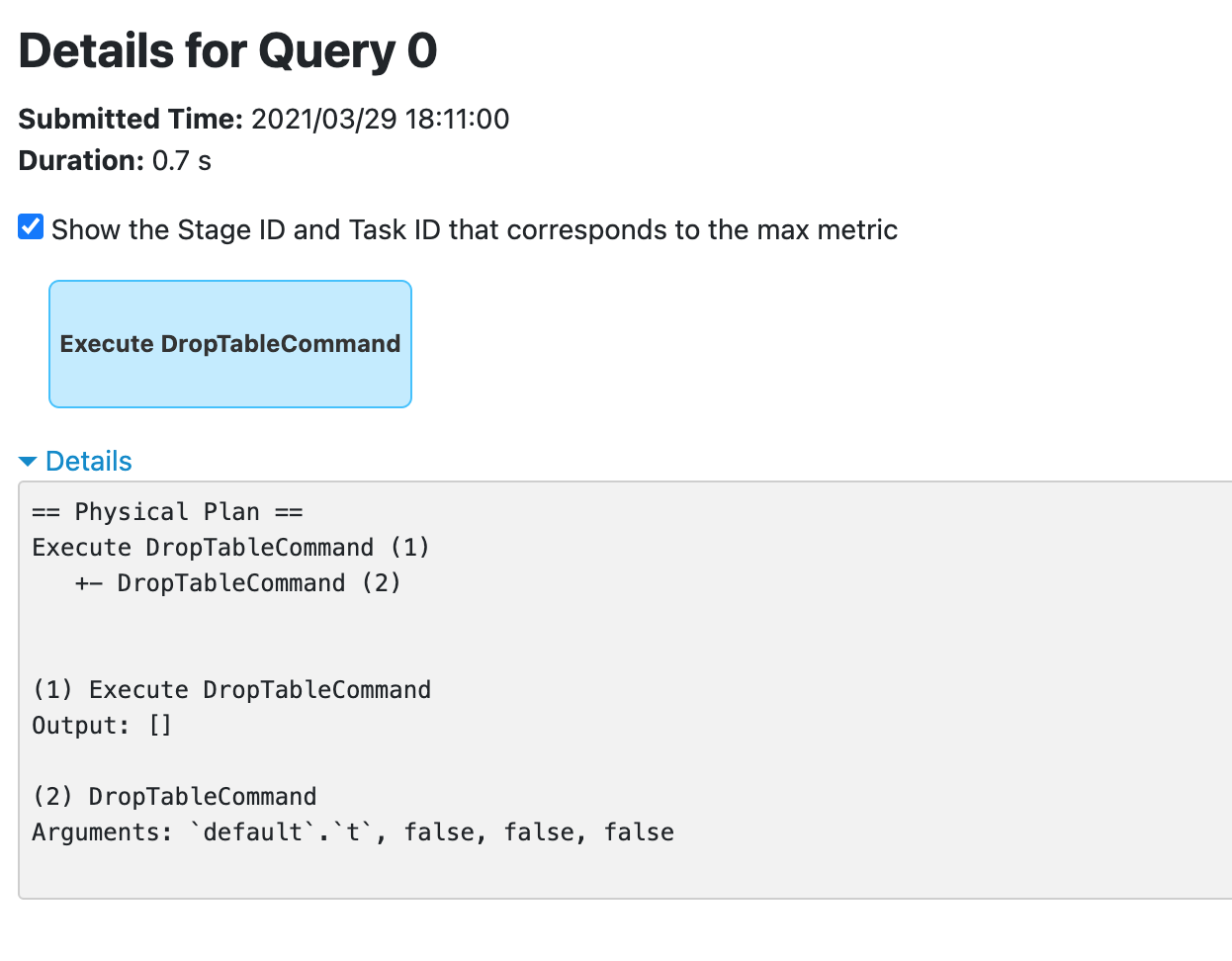 > This seems like a different issue, as the reported bug is the SQL execution appears twice, not 3 times. Run SQL below in spark-sql ``` spark-sql> DROP TABLE t; ``` Wen can see 2 SQL queries:    I think it's better to show only one SQL query in SQL UI, we have two choices: 1. only show the `DropTableCommand` 2. combine the two executions for one SQL into one item in SQL UI. -- This is an automated message from the Apache Git Service. To respond to the message, please log on to GitHub and use the URL above to go to the specific comment. For queries about this service, please contact Infrastructure at: [email protected] --------------------------------------------------------------------- To unsubscribe, e-mail: [email protected] For additional commands, e-mail: [email protected]