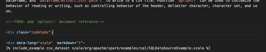########## File path: docs/sql-data-sources-csv.md ########## @@ -0,0 +1,54 @@ +--- +layout: global +title: CSV Files +displayTitle: CSV Files +license: | + Licensed to the Apache Software Foundation (ASF) under one or more + contributor license agreements. See the NOTICE file distributed with + this work for additional information regarding copyright ownership. + The ASF licenses this file to You under the Apache License, Version 2.0 + (the "License"); you may not use this file except in compliance with + the License. You may obtain a copy of the License at + + http://www.apache.org/licenses/LICENSE-2.0 + + Unless required by applicable law or agreed to in writing, software + distributed under the License is distributed on an "AS IS" BASIS, + WITHOUT WARRANTIES OR CONDITIONS OF ANY KIND, either express or implied. + See the License for the specific language governing permissions and + limitations under the License. +--- + +<div class="codetabs"> + +<div data-lang="scala" markdown="1"> + +Spark SQL provides `spark.read.csv("file_name")` to read a CSV file into Spark DataFrame and `dataframe.write.csv("path")` to save or write to the CSV file. Function `option()` provides customized behavior during reading csv files. The customized behavior includes but not limit to configuring header, delimiter, charset. The detailed usage about `option()` can be found in [spark-csv](https://github.com/databricks/spark-csv), notice that some contents might be outdated in spark-csv. + +`spark.read.csv()` also can be used to read all files in a directory by passing a directory path. Please notice that Spark will not check the file name extension and all files will be read into dataframe. + +{% include_example csv_dataset scala/org/apache/spark/examples/sql/SQLDataSourceExample.scala %} + +</div> + +<div data-lang="java" markdown="1"> + +Spark SQL provides `spark.read().csv("file_name")` to read a CSV file into Spark DataFrame and `dataframe.write().csv("path")` to save or write to the CSV file. Function `option()` provides customized behavior during reading csv files. The customized behavior includes but not limit to configuring header, delimiter, charset. The detailed usage about `option()` can be found in [spark-csv](https://github.com/databricks/spark-csv), notice that some contents might be outdated in spark-csv. Review comment: > Yeah, I think we don't need to mention about spark-csv here. Also, the options will be documented later via [SPARK-34494](https://issues.apache.org/jira/browse/SPARK-34494) In addition, it seems the `option()` will be documented separately in the future, so I leave a comment in the markdown file like this:  -- This is an automated message from the Apache Git Service. To respond to the message, please log on to GitHub and use the URL above to go to the specific comment. For queries about this service, please contact Infrastructure at: [email protected] --------------------------------------------------------------------- To unsubscribe, e-mail: [email protected] For additional commands, e-mail: [email protected]