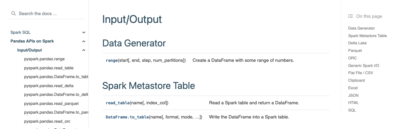 ### What changes were proposed in this pull request? This PR proposes to change from:  to:  ### Why are the changes needed? pandas APIs on Spark (pandas on Spark) is a package in PySpark in the end. So it has to be documented in the same level with other packages (e.g., Spark SQL). ### Does this PR introduce _any_ user-facing change? Yes, it changes the structure of the docs. To end users, no as it's only in development branch. ### How was this patch tested? Manually tested as above. -- This is an automated message from the Apache Git Service. To respond to the message, please log on to GitHub and use the URL above to go to the specific comment. For queries about this service, please contact Infrastructure at: [email protected] --------------------------------------------------------------------- To unsubscribe, e-mail: [email protected] For additional commands, e-mail: [email protected]