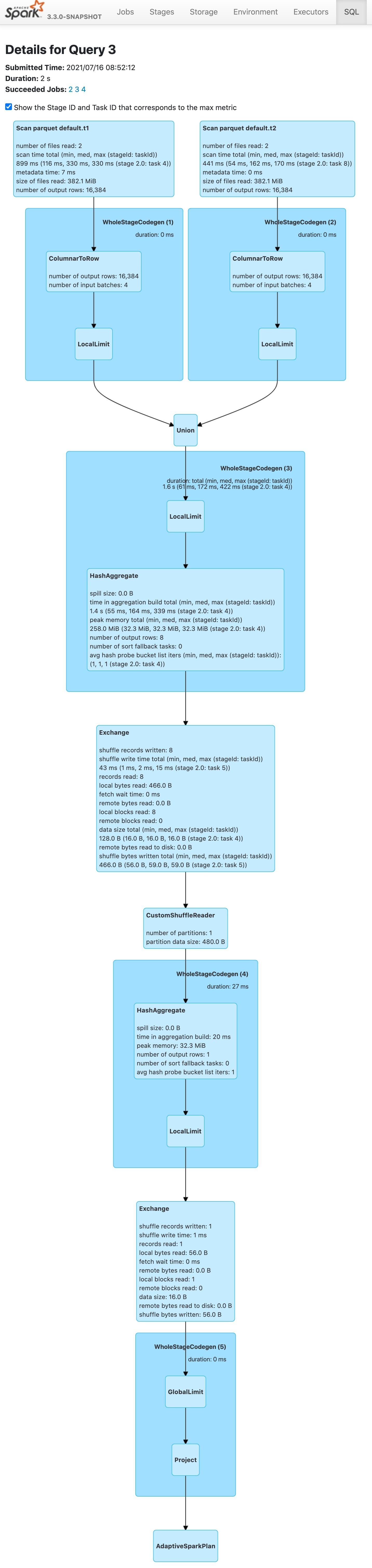 ### What changes were proposed in this pull request? Push down limit 1 through `Aggregate` if it is group only. For example: ```sql create table t1 using parquet as select id from range(100000000L); create table t2 using parquet as select id from range(100000000L); create view v1 as select * from t1 union select * from t2; select * from v1 limit 1; ``` Before this PR | After this PR -- | --  |  ### Why are the changes needed? Improve query performance. ### Does this PR introduce _any_ user-facing change? No. ### How was this patch tested? Unit test. -- This is an automated message from the Apache Git Service. To respond to the message, please log on to GitHub and use the URL above to go to the specific comment. To unsubscribe, e-mail: [email protected] For queries about this service, please contact Infrastructure at: [email protected] --------------------------------------------------------------------- To unsubscribe, e-mail: [email protected] For additional commands, e-mail: [email protected]