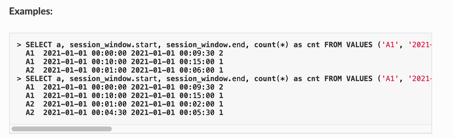 ########## File path: sql/catalyst/src/main/scala/org/apache/spark/sql/catalyst/expressions/SessionWindow.scala ########## @@ -35,6 +35,34 @@ import org.apache.spark.unsafe.types.UTF8String * duration during the query execution. Note that the rows with negative or * zero gap duration will be filtered out from the aggregation. */ +// scalastyle:off line.size.limit +@ExpressionDescription( + usage = """ + _FUNC_(time_column, gap_duration) - Generates session window given a timestamp specifying column and gap duration. + See <a href="https://spark.apache.org/docs/latest/structured-streaming-programming-guide.html#types-of-time-windows">'Types of time windows'</a> in Structured Streaming guide doc for detailed explanation and examples. + """, + arguments = """ + Arguments: + * time_column - The column or the expression to use as the timestamp for windowing by time. The time column must be of TimestampType. + * gap_duration - A string specifying the timeout of the session represented as "interval value" + (See <a href="https://spark.apache.org/docs/latest/sql-ref-literals.html#interval-literal">Interval Literal</a> for more details.) for the fixed gap duration, or + an expression which is applied for each input and evaluated to the "interval value" for the dynamic gap duration. + """, + examples = """ + Examples: + > SELECT a, session_window.start, session_window.end, count(*) as cnt FROM VALUES ('A1', '2021-01-01 00:00:00'), ('A1', '2021-01-01 00:04:30'), ('A1', '2021-01-01 00:10:00'), ('A2', '2021-01-01 00:01:00') AS tab(a, b) GROUP by a, session_window(b, '5 minutes') ORDER BY a, start; Review comment: Nit: this is quite long. We can consider creating a temp view for the values.  -- This is an automated message from the Apache Git Service. To respond to the message, please log on to GitHub and use the URL above to go to the specific comment. To unsubscribe, e-mail: [email protected] For queries about this service, please contact Infrastructure at: [email protected] --------------------------------------------------------------------- To unsubscribe, e-mail: [email protected] For additional commands, e-mail: [email protected]