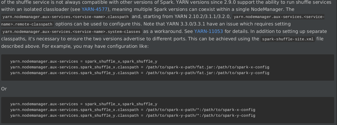 ### What changes were proposed in this pull request? We have tried to run multiple versions of the Spark Shuffle Service according https://github.com/apache/spark/blob/master/docs/running-on-yarn.md but, it wont work. Then we solved it by using colon when writing %s.classpath instead of commas. Related discussing is in https://issues.apache.org/jira/browse/YARN-4577?focusedCommentId=17493624&page=com.atlassian.jira.plugin.system.issuetabpanels%3Acomment-tabpanel#comment-17493624 ### Why are the changes needed? User may confused when they following the current document to deploy multi-versions Spark Shuffle Service on YARN ### Does this PR introduce _any_ user-facing change? User document changes. ### How was this patch tested?  -- This is an automated message from the Apache Git Service. To respond to the message, please log on to GitHub and use the URL above to go to the specific comment. To unsubscribe, e-mail: [email protected] For queries about this service, please contact Infrastructure at: [email protected] --------------------------------------------------------------------- To unsubscribe, e-mail: [email protected] For additional commands, e-mail: [email protected]