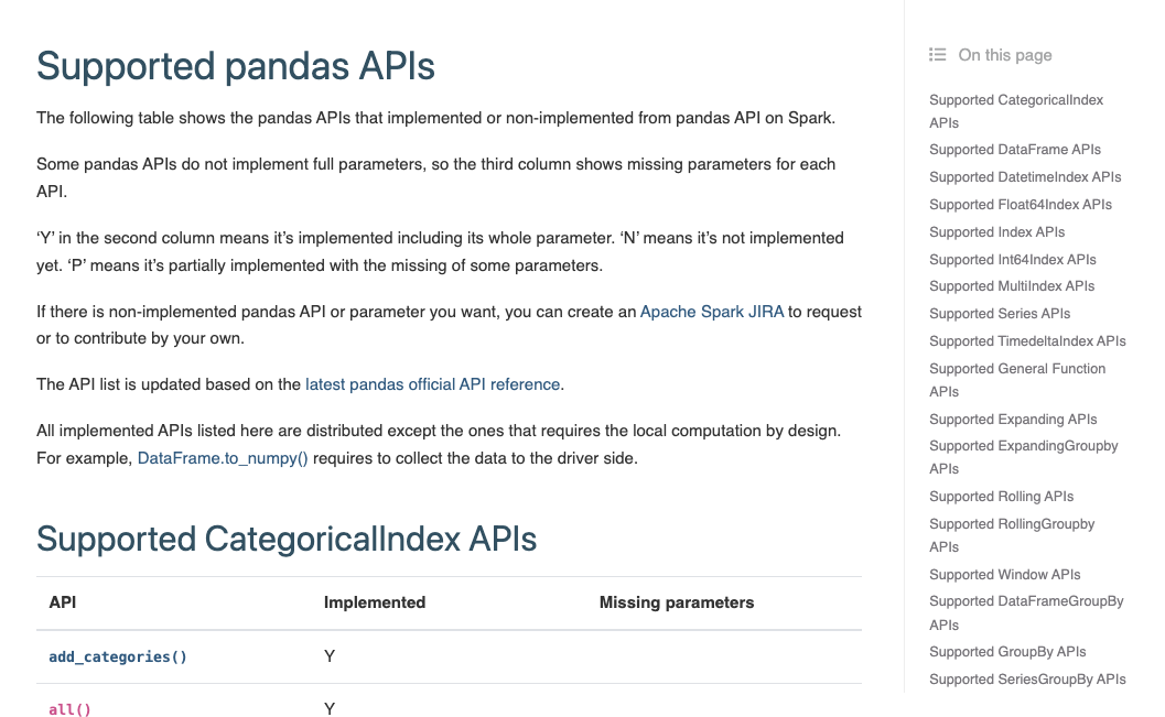 ########## python/pyspark/pandas/supported_api_gen.py: ########## @@ -0,0 +1,377 @@ +# +# Licensed to the Apache Software Foundation (ASF) under one or more +# contributor license agreements. See the NOTICE file distributed with +# this work for additional information regarding copyright ownership. +# The ASF licenses this file to You under the Apache License, Version 2.0 +# (the "License"); you may not use this file except in compliance with +# the License. You may obtain a copy of the License at +# +# http://www.apache.org/licenses/LICENSE-2.0 +# +# Unless required by applicable law or agreed to in writing, software +# distributed under the License is distributed on an "AS IS" BASIS, +# WITHOUT WARRANTIES OR CONDITIONS OF ANY KIND, either express or implied. +# See the License for the specific language governing permissions and +# limitations under the License. +# + +""" +Generate 'Supported pandas APIs' documentation file +""" +import warnings +from distutils.version import LooseVersion +from enum import Enum, unique +from inspect import getmembers, isclass, isfunction, signature +from typing import Any, Callable, Dict, List, NamedTuple, Set, TextIO, Tuple + +import pyspark.pandas as ps +import pyspark.pandas.groupby as psg +import pyspark.pandas.window as psw + +import pandas as pd +import pandas.core.groupby as pdg +import pandas.core.window as pdw + +MAX_MISSING_PARAMS_SIZE = 5 +COMMON_PARAMETER_SET = { + "kwargs", + "args", + "cls", +} # These are not counted as missing parameters. +MODULE_GROUP_MATCH = [(pd, ps), (pdw, psw), (pdg, psg)] + +RST_HEADER = """ +===================== +Supported pandas APIs +===================== + +.. currentmodule:: pyspark.pandas + +The following table shows the pandas APIs that implemented or non-implemented from pandas API on +Spark. + +Some pandas APIs do not implement full parameters, so the third column shows missing parameters for +each API. + +'Y' in the second column means it's implemented including its whole parameter. +'N' means it's not implemented yet. +'P' means it's partially implemented with the missing of some parameters. + +If there is non-implemented pandas API or parameter you want, you can create an `Apache Spark +JIRA <https://issues.apache.org/jira/projects/SPARK/summary>`__ to request or to contribute by your +own. + +The API list is updated based on the `latest pandas official API +reference <https://pandas.pydata.org/docs/reference/index.html#>`__. + +All implemented APIs listed here are distributed except the ones that requires the local +computation by design. For example, `DataFrame.to_numpy() <https://spark.apache.org +/docs/latest/api/python/reference/pyspark.pandas/api/pyspark.pandas.DataFrame. +to_numpy.html>`__ requires to collect the data to the driver side. + +""" + + +@unique +class Implemented(Enum): + IMPLEMENTED = "Y" + NOT_IMPLEMENTED = "N" + PARTIALLY_IMPLEMENTED = "P" + + +class SupportedStatus(NamedTuple): + """ + Defines a supported status for a specific pandas API + """ + + implemented: str + missing: str + + +def generate_supported_api(output_rst_file_path: str) -> None: + """ + Generate supported APIs status dictionary. + Parameters + ---------- + output_rst_file_path : str + The path to the document file in RST format. + + Write supported APIs documentation. + """ + if LooseVersion(pd.__version__) < LooseVersion("1.4.0"): + warnings.warn( + "Warning: Latest version of pandas(>=1.4.0) is required to generate the documentation; " + + "however, your version was %s" % pd.__version__, + UserWarning, + ) + + all_supported_status: Dict[Tuple[str, str], Dict[str, SupportedStatus]] = {} + for pd_module_group, ps_module_group in MODULE_GROUP_MATCH: + pd_modules = _get_pd_modules(pd_module_group) + _update_all_supported_status( + all_supported_status, pd_modules, pd_module_group, ps_module_group + ) + _write_rst(output_rst_file_path, all_supported_status) + + +def _create_supported_by_module( + module_name: str, pd_module_group: Any, ps_module_group: Any +) -> Dict[str, SupportedStatus]: + """ + Retrieves supported status of pandas module + + Parameters + ---------- + module_name : str + Class name that exists in the path of the module. + pd_module_group : Any + Specific path of importable pandas module. + ps_module_group: Any + Specific path of importable pyspark.pandas module. + """ + pd_module = getattr(pd_module_group, module_name) if module_name else pd_module_group + try: + ps_module = getattr(ps_module_group, module_name) if module_name else ps_module_group + except AttributeError: + # module not implemented + return {} + + pd_funcs = dict([m for m in getmembers(pd_module, isfunction) if not m[0].startswith("_")]) + if not pd_funcs: + return {} + + ps_funcs = dict([m for m in getmembers(ps_module, isfunction) if not m[0].startswith("_")]) + + return _organize_by_implementation_status( + module_name, pd_funcs, ps_funcs, pd_module_group, ps_module_group + ) + + +def _organize_by_implementation_status( + module_name: str, + pd_funcs: Dict[str, Callable], + ps_funcs: Dict[str, Callable], + pd_module_group: Any, + ps_module_group: Any, +) -> Dict[str, SupportedStatus]: + """ + Check the implementation status and parameters of both modules. + + Parmeters + --------- + module_name : str + Class name that exists in the path of the module. + pd_funcs: Dict[str, Callable] + function name and function object mapping of pandas module. + ps_funcs: Dict[str, Callable] + function name and function object mapping of pyspark.pandas module. + pd_module_group : Any + Specific path of importable pandas module. + ps_module_group: Any + Specific path of importable pyspark.pandas module. + """ + pd_dict = {} + for pd_func_name, pd_func in pd_funcs.items(): + ps_func = ps_funcs.get(pd_func_name) + if ps_func: + missing_set = ( + set(signature(pd_func).parameters) + - set(signature(ps_func).parameters) + - COMMON_PARAMETER_SET + ) + if missing_set: + # partially implemented + pd_dict[pd_func_name] = SupportedStatus( + implemented=
