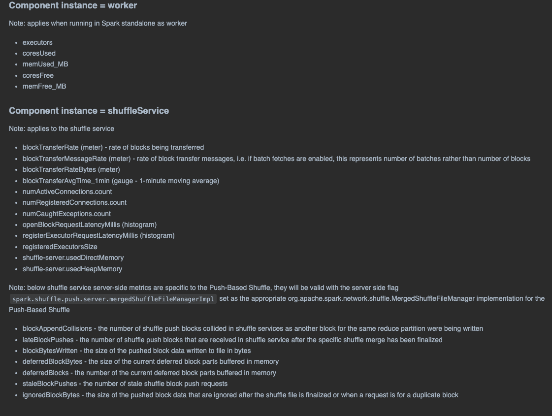 ########## docs/monitoring.md: ########## @@ -1421,6 +1421,20 @@ Note: applies to the shuffle service - shuffle-server.usedDirectMemory - shuffle-server.usedHeapMemory +- Notes: below shuffle service server-side metrics are specific to the Push-Based Shuffle +(with `spark.shuffle.push.enabled` set as true on the client side, and with the server side +flag `spark.shuffle.push.server.mergedShuffleFileManagerImpl` set as the appropriate +org.apache.spark.network.shuffle.MergedShuffleFileManager implementation for the Push-Based +Shuffle to be enabled) Review Comment: I removed the client side config in the description. As for the format for note, I'm following the format at L1408, L1399, L1392, and L1384. This is the preview after the change:  Let me know if you have further input, thanks @zhouyejoe ! -- This is an automated message from the Apache Git Service. To respond to the message, please log on to GitHub and use the URL above to go to the specific comment. To unsubscribe, e-mail: [email protected] For queries about this service, please contact Infrastructure at: [email protected] --------------------------------------------------------------------- To unsubscribe, e-mail: [email protected] For additional commands, e-mail: [email protected]
