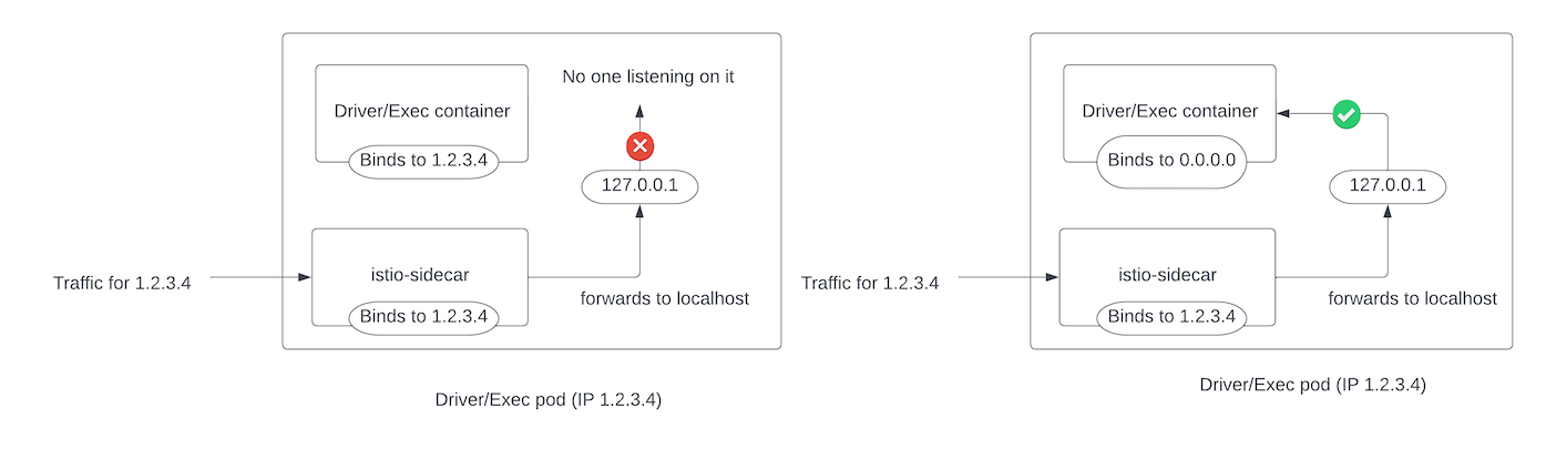 executors to only bind to Pod IP and therefore does not work with Istio.