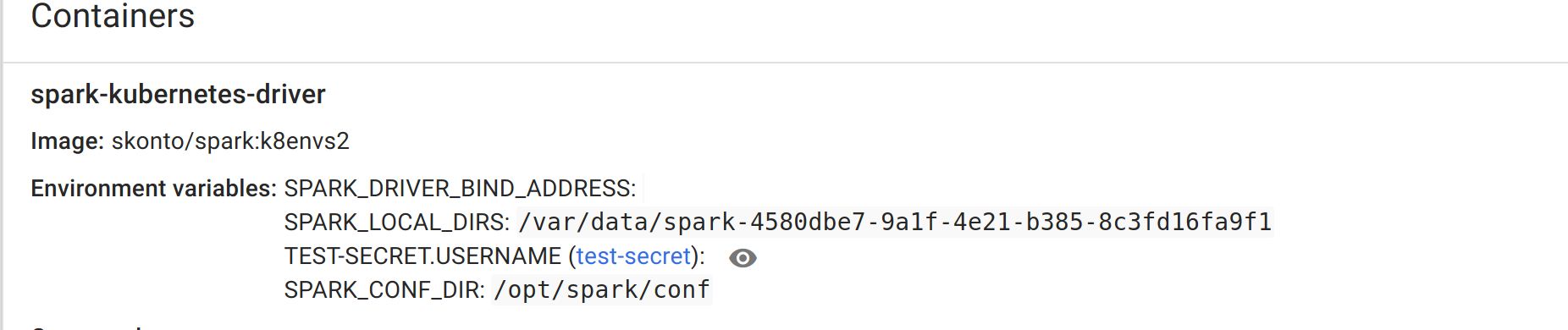 --conf spark.kubernetes.driver.secretKeyRef.test-secret=username \