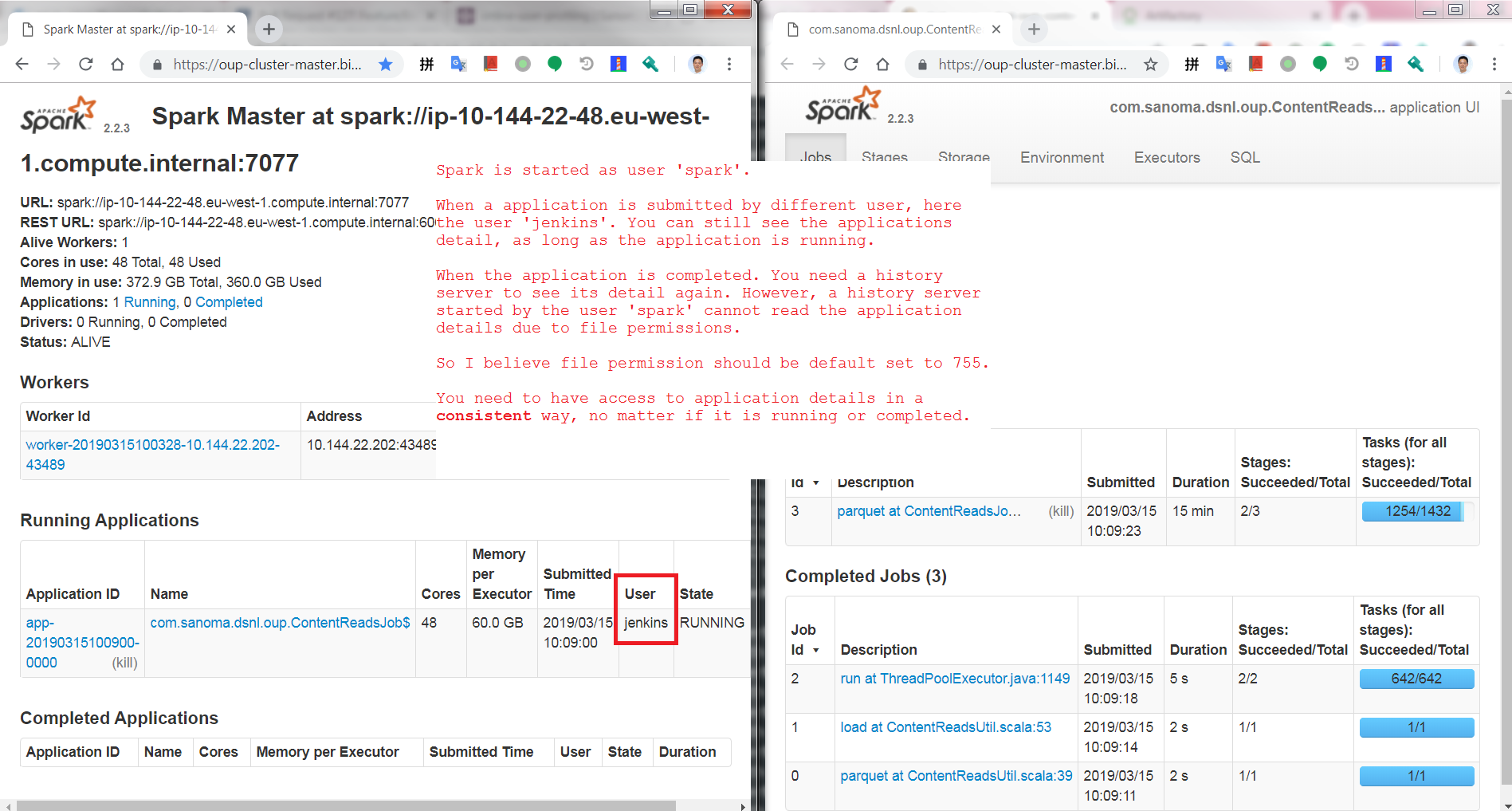 happyhua commented on issue #23827: [SPARK-26912][CORE][HISTORY] Allow setting permission for event_log URL: https://github.com/apache/spark/pull/23827#issuecomment-473238652  Just make a screenshot. You need to have access to application details in a consistent way. It does not make any sense that you as user A can see applications detail of user B, when application is running. But no more, when application is completed.