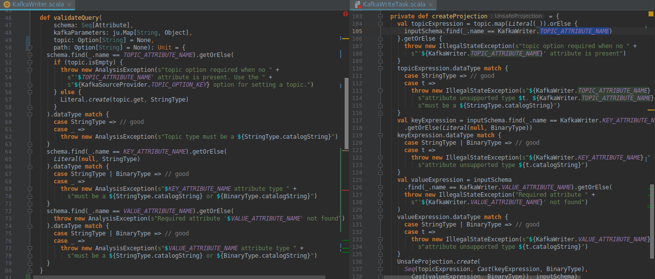########## File path: docs/structured-streaming-kafka-integration.md ########## @@ -457,8 +463,17 @@ The following configurations are optional: <td>string</td> <td>none</td> <td>streaming and batch</td> + <td>Sets the topic that all rows will be written to in Kafka. This option overrides + ```path``` option and any topic column that may exist in the data.</td> +</tr> +<tr> + <td>path</td> + <td>string</td> + <td>none</td> + <td>streaming and batch</td> <td>Sets the topic that all rows will be written to in Kafka. This option overrides any - topic column that may exist in the data.</td> + topic column that may exist in the data and is overridden by ```topic``` option. Review comment: @gaborgsomogyi I agree with you, that first solution seems to be right way to go. I hope that I will not miss any place where it is used, while writing unit tests. My concern is about checking the topic column value. We cannot move the projection out of KafkaWriteTask, but if we move all the validation inside, than it would no longer be fail-fast: in current implementation we are checking all that we can before RDD creation. Although, I do not really understand why checks are duplicated between [KafkaWriteTask#createProjection](https://github.com/apache/spark/blob/master/external/kafka-0-10-sql/src/main/scala/org/apache/spark/sql/kafka010/KafkaWriteTask.scala#L101) and [KafkaWriter#validateQuery](https://github.com/apache/spark/blob/master/external/kafka-0-10-sql/src/main/scala/org/apache/spark/sql/kafka010/KafkaWriter.scala#L45)? As I can see validateQuery is always called before createProjection. @gaborgsomogyi @jaceklaskowski do you know any reason for this duplication?  The solution I propose: - remove duplicated checks from KafkaWriteTask#createProjection - move check for topic and path option match to KafkaWriter#validateQuery - add topic option and topic attribute match validation to KafkaWriteTask ---------------------------------------------------------------- This is an automated message from the Apache Git Service. To respond to the message, please log on to GitHub and use the URL above to go to the specific comment. For queries about this service, please contact Infrastructure at: [email protected] With regards, Apache Git Services --------------------------------------------------------------------- To unsubscribe, e-mail: [email protected] For additional commands, e-mail: [email protected]