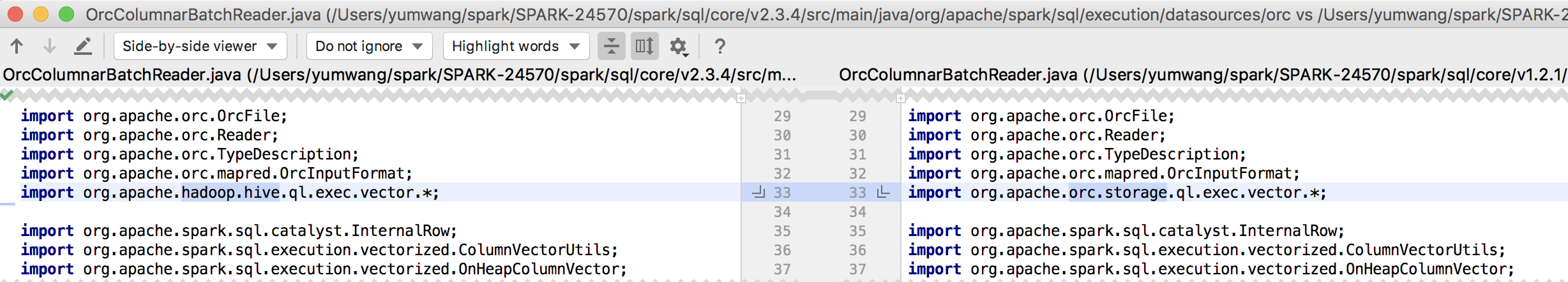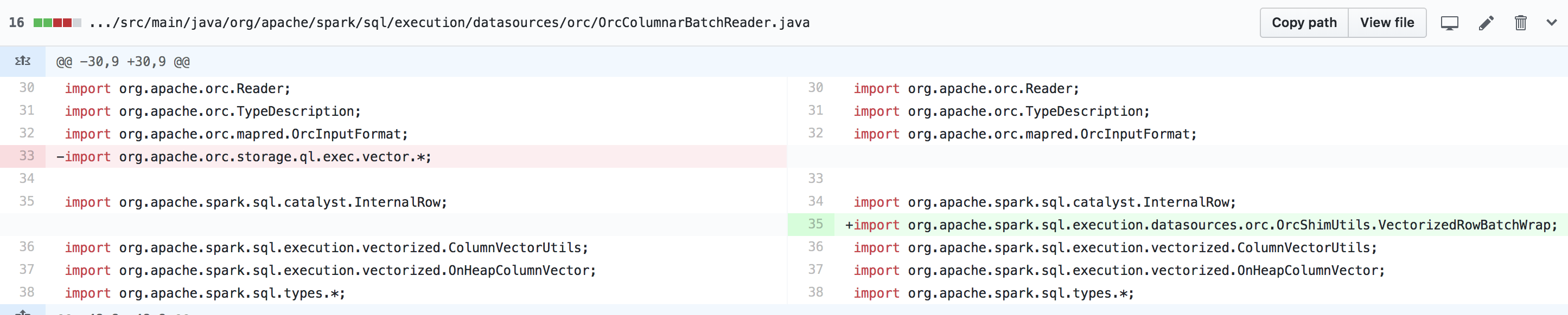 ########## File path: sql/core/src/main/scala/org/apache/spark/sql/execution/datasources/orc/OrcShimUtils.scala ########## @@ -0,0 +1,66 @@ +/* + * Licensed to the Apache Software Foundation (ASF) under one or more + * contributor license agreements. See the NOTICE file distributed with + * this work for additional information regarding copyright ownership. + * The ASF licenses this file to You under the Apache License, Version 2.0 + * (the "License"); you may not use this file except in compliance with + * the License. You may obtain a copy of the License at + * + * http://www.apache.org/licenses/LICENSE-2.0 + * + * Unless required by applicable law or agreed to in writing, software + * distributed under the License is distributed on an "AS IS" BASIS, + * WITHOUT WARRANTIES OR CONDITIONS OF ANY KIND, either express or implied. + * See the License for the specific language governing permissions and + * limitations under the License. + */ + +package org.apache.spark.sql.execution.datasources.orc + +import java.sql.Date + +import org.apache.orc.storage.common.`type`.HiveDecimal +import org.apache.orc.storage.ql.exec.vector.VectorizedRowBatch +import org.apache.orc.storage.ql.io.sarg.{SearchArgument => OrcSearchArgument} +import org.apache.orc.storage.ql.io.sarg.PredicateLeaf.{Operator => OrcOperator} +import org.apache.orc.storage.serde2.io.{DateWritable, HiveDecimalWritable} + +import org.apache.spark.sql.catalyst.expressions.SpecializedGetters +import org.apache.spark.sql.types.Decimal + +/** + * Various utilities for ORC used to upgrade the built-in Hive. + */ +private[sql] object OrcShimUtils { + + class VectorizedRowBatchWrap(val batch: VectorizedRowBatch) {} Review comment: To reduce code duplication of `OrcColumnarBatchReader`. Before this change. We need to copy `OrcColumnarBatchReader` for Hive 2.3.4 because of `org.apache.orc.storage.ql.exec.vector.VectorizedRowBatch` from different packages:  After this change. We don't need to copy `OrcColumnarBatchReader`. just copy `OrcShimUtils` for Hive 2.3.4:  ---------------------------------------------------------------- This is an automated message from the Apache Git Service. To respond to the message, please log on to GitHub and use the URL above to go to the specific comment. For queries about this service, please contact Infrastructure at: [email protected] With regards, Apache Git Services --------------------------------------------------------------------- To unsubscribe, e-mail: [email protected] For additional commands, e-mail: [email protected]