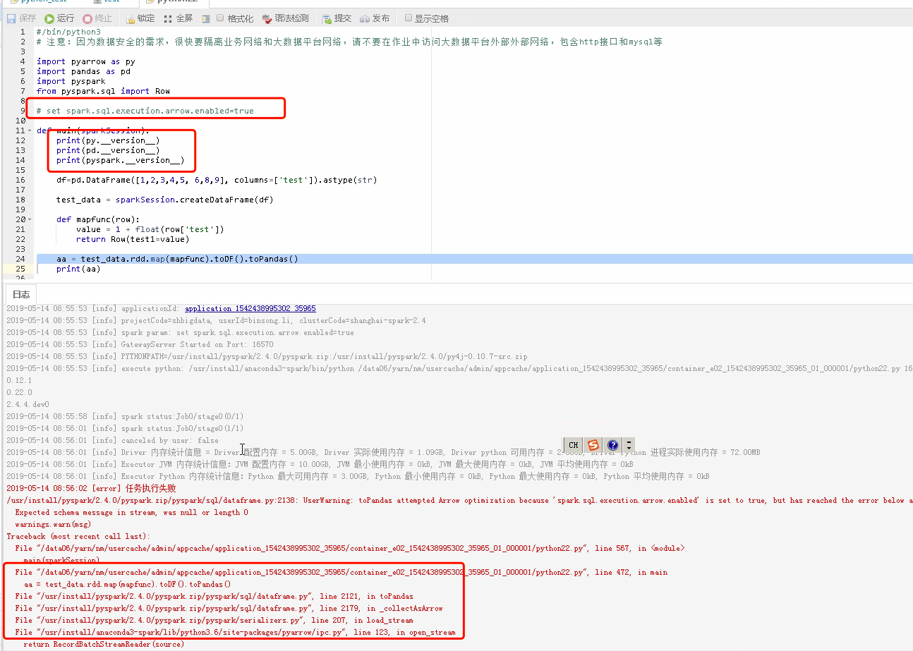 melin edited a comment on issue #23657: [SPARK-26566][PYTHON][SQL] Upgrade Apache Arrow to version 0.12.0 URL: https://github.com/apache/spark/pull/23657#issuecomment-492044362 The following error occurred in spark 2.4