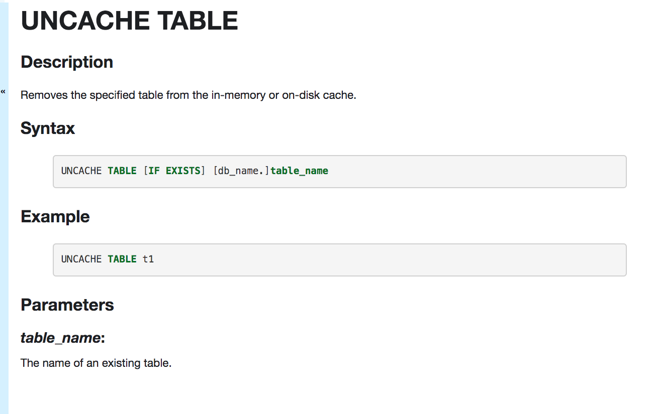 huaxingao removed a comment on issue #25540: [SPARK-28830][DOC][SQL]Document UNCACHE TABLE statement in SQL Reference URL: https://github.com/apache/spark/pull/25540#issuecomment-523693037